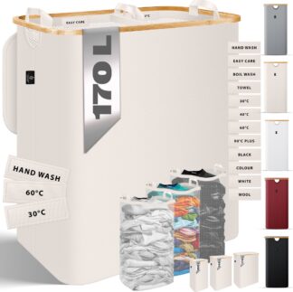 Wasmand – 3 vakken – beige met tekst – 90 liter – 60 cm hoog