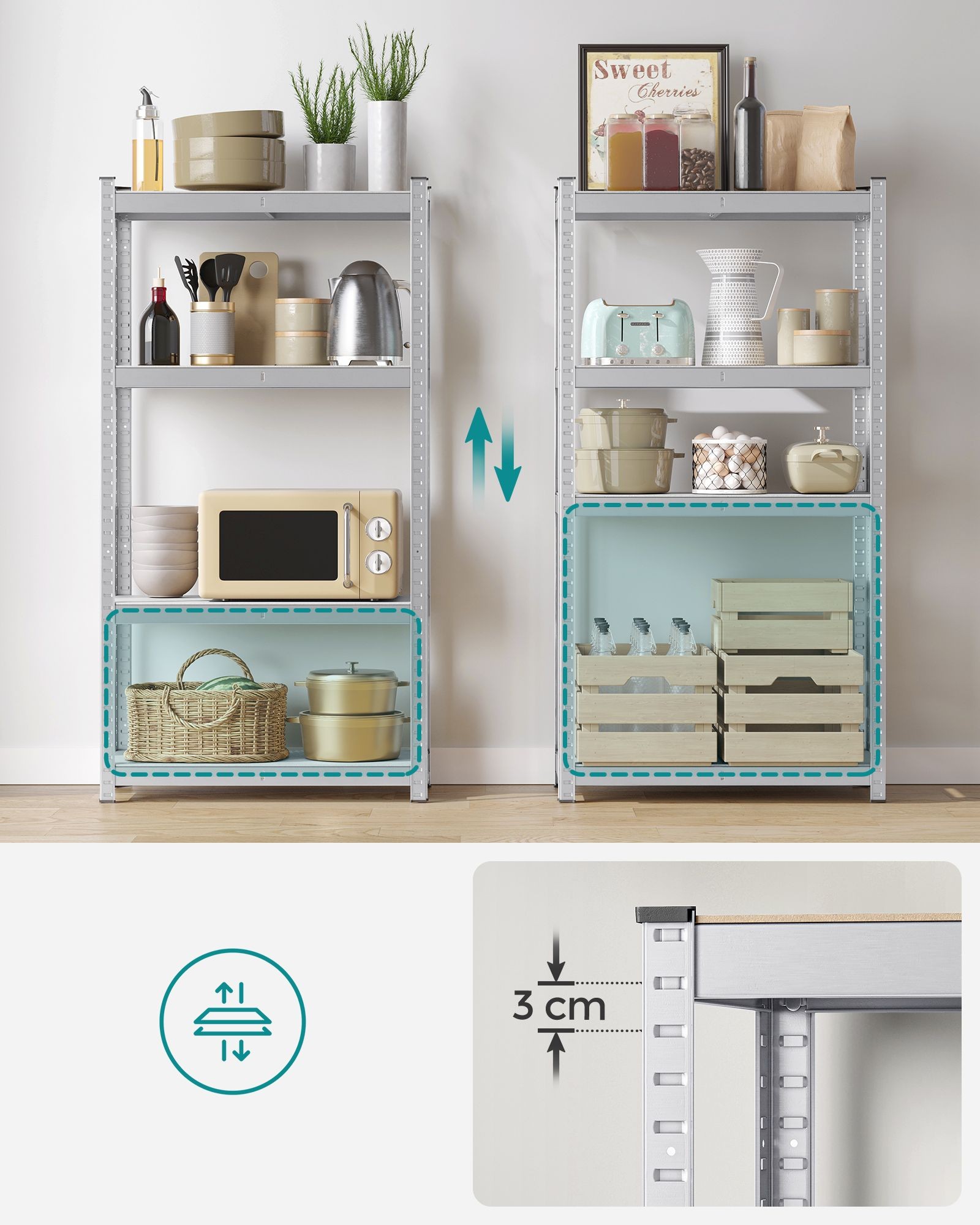 Duurzaam en stabiel: de robuuste plank is gemaakt van een stalen frame, elke plank kan tot 130 kg dragen. Met de meegeleverde kantelbeveiliging kan de plank aan de muur worden bevestigd, waardoor hij stabieler en veiliger is.
