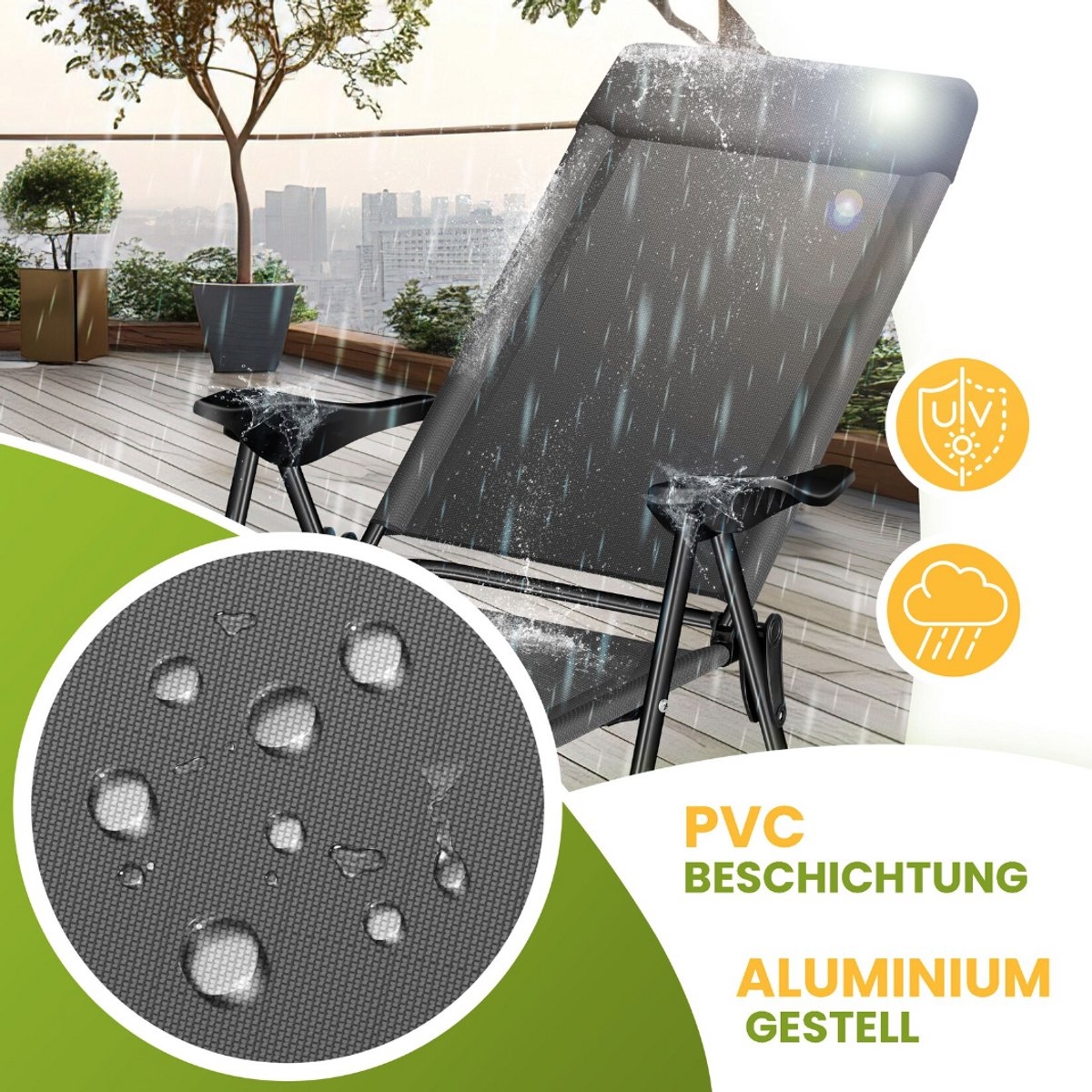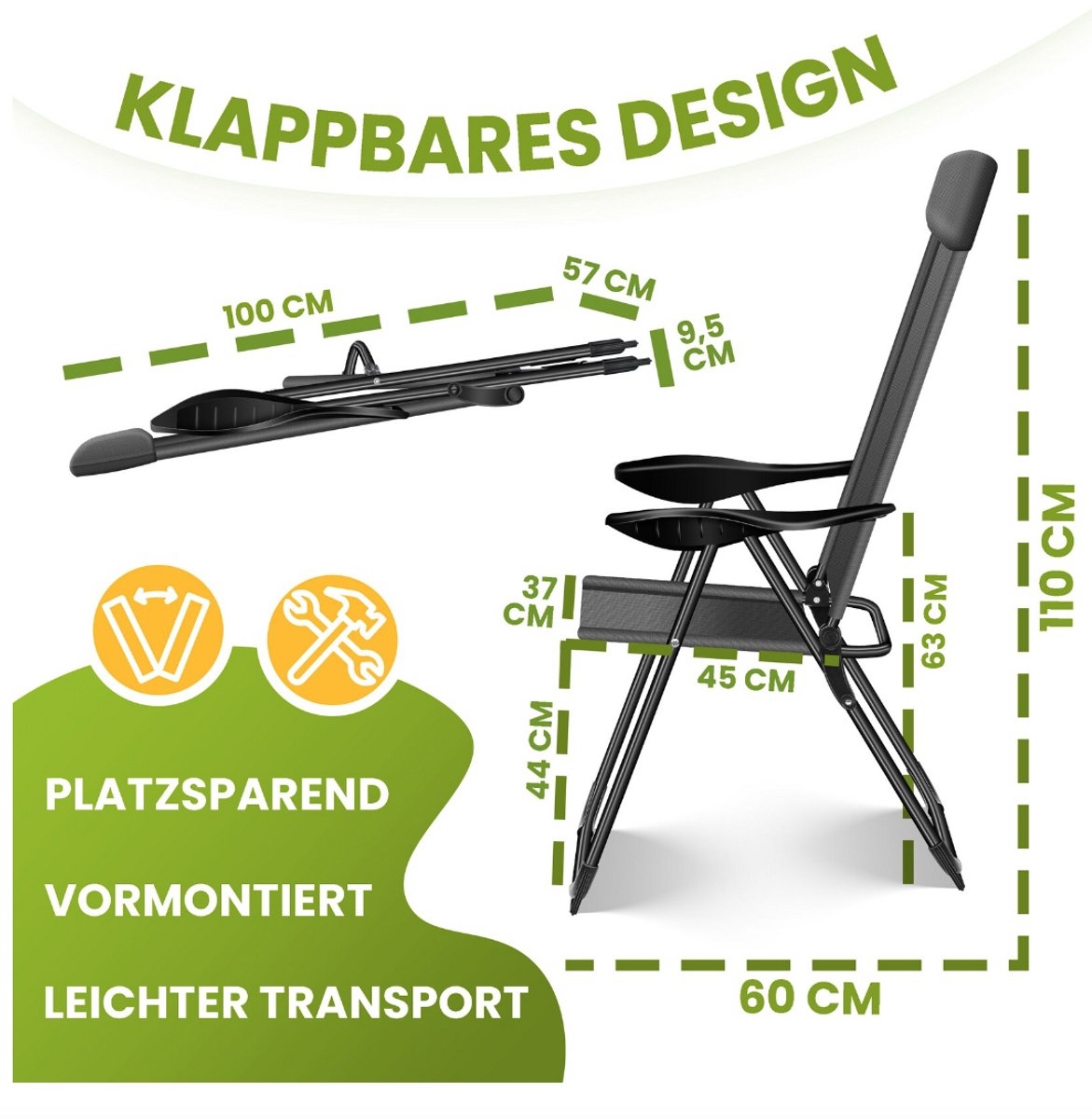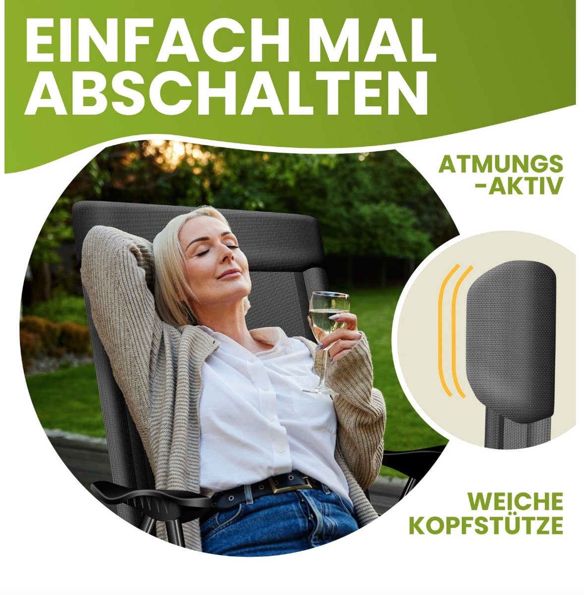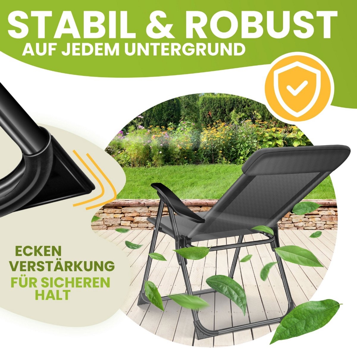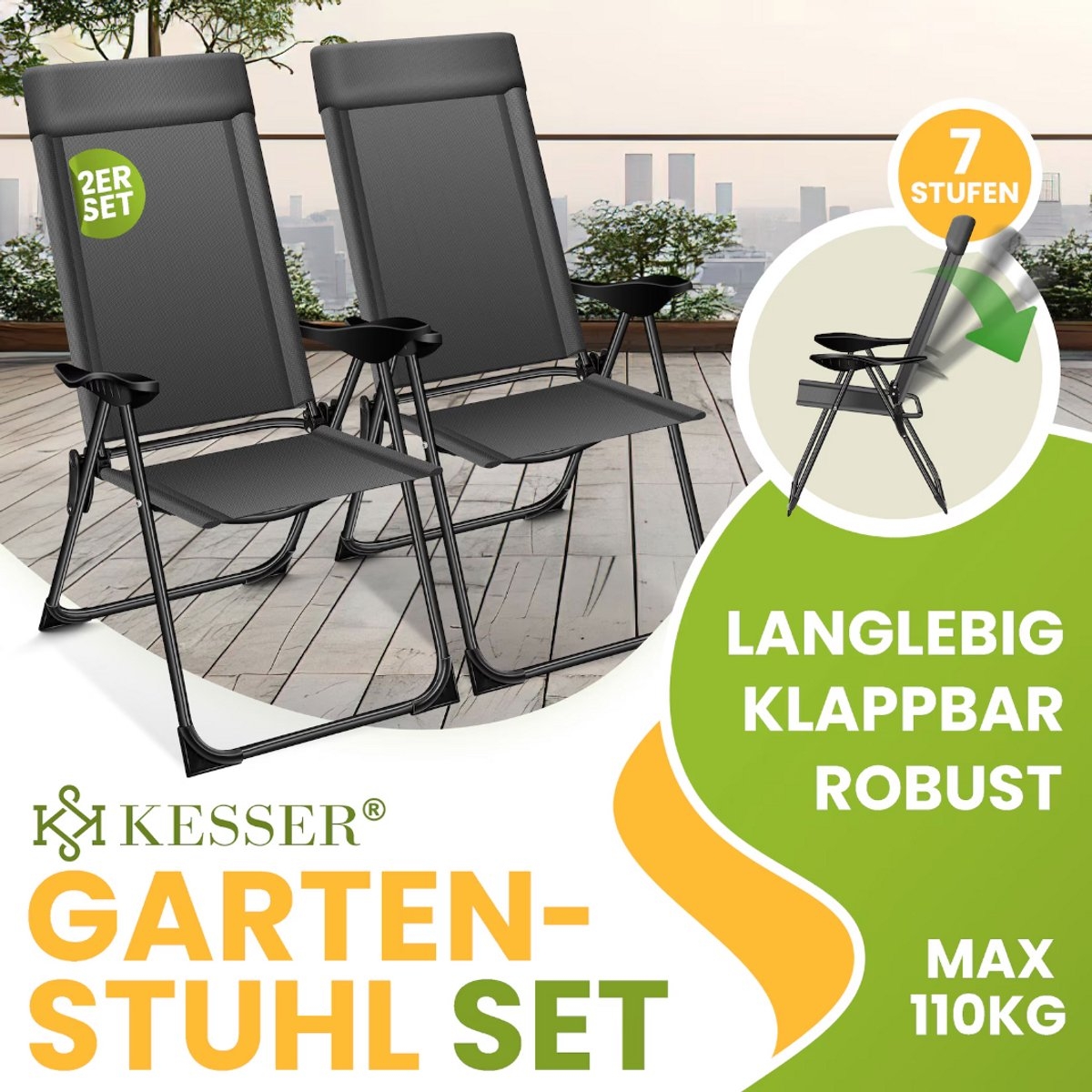 Wie een tuin , balkon of terras heeft, heeft naast een passende tuintafel ook een geschikte zithoek nodig . Onze tuinstoelen basisset biedt de ideale mogelijkheid om de tijd met familie of vrienden zo aangenaam mogelijk te maken . Leun achterover en ontspan ! – Of u nu een barbecue houdt met uw geliefden of gewoon lekker ontspant of zonnebaadt – onze ligstoel biedt talloze gebruiksmogelijkheden voor de perfecte zomer ! Onze hoogwaardige ligstoel kunt u met slechts enkele handelingen eenvoudig opvouwen . Zo kunt u uw tuinmeubilair ruimtebesparend in de kofferbak opbergen . Zo bent u optimaal uitgerust voor uw volgende kampeervakantie en kunt u gezellige avonden met vrienden doorbrengen voor uw tent of caravan . Vul de KESSER tuinstoelenset aan met een andere set en profiteer van een gezellige en comfortabele tafelgroep . Haal het maximale uit onze kampeerstoelen ; Dankzij de 7 -voudig verstelbare rugleuningen van de KESSER tuinstoel geniet u van optimaal zitcomfort . Pas de hoek naar wens aan . Wilt u genieten van de zon en gewoon even helemaal tot rust komen ? Plaats vervolgens de ligstoel in de ligstand