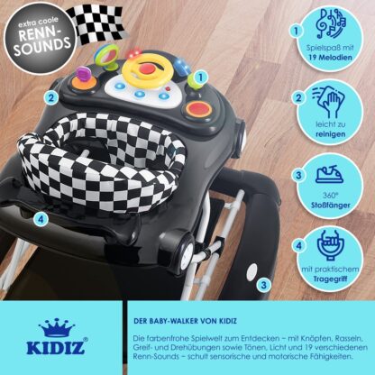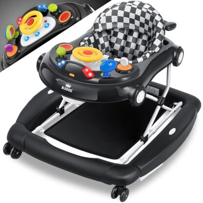 ENTERTAINMENT EN RELAXATIE: Knoppen, rammelaars, grijp- en draaioefeningen, maar ook geluiden, lichtjes en 12 verschillende melodietjes – sla nu toe en daag de motorische & zintuiglijke vaardigheden van je baby uit en stimuleer ze met de babywalker in een kleurrijke speelwereld. Wie loopt, speelt en eet, wil op zijn tijd ook rustig slapen. Met slechts één “klik” en één draai kun je de babywalker omtoveren tot een praktische babyschommelstoel. Je kind en jij zullen er dol op zijn!