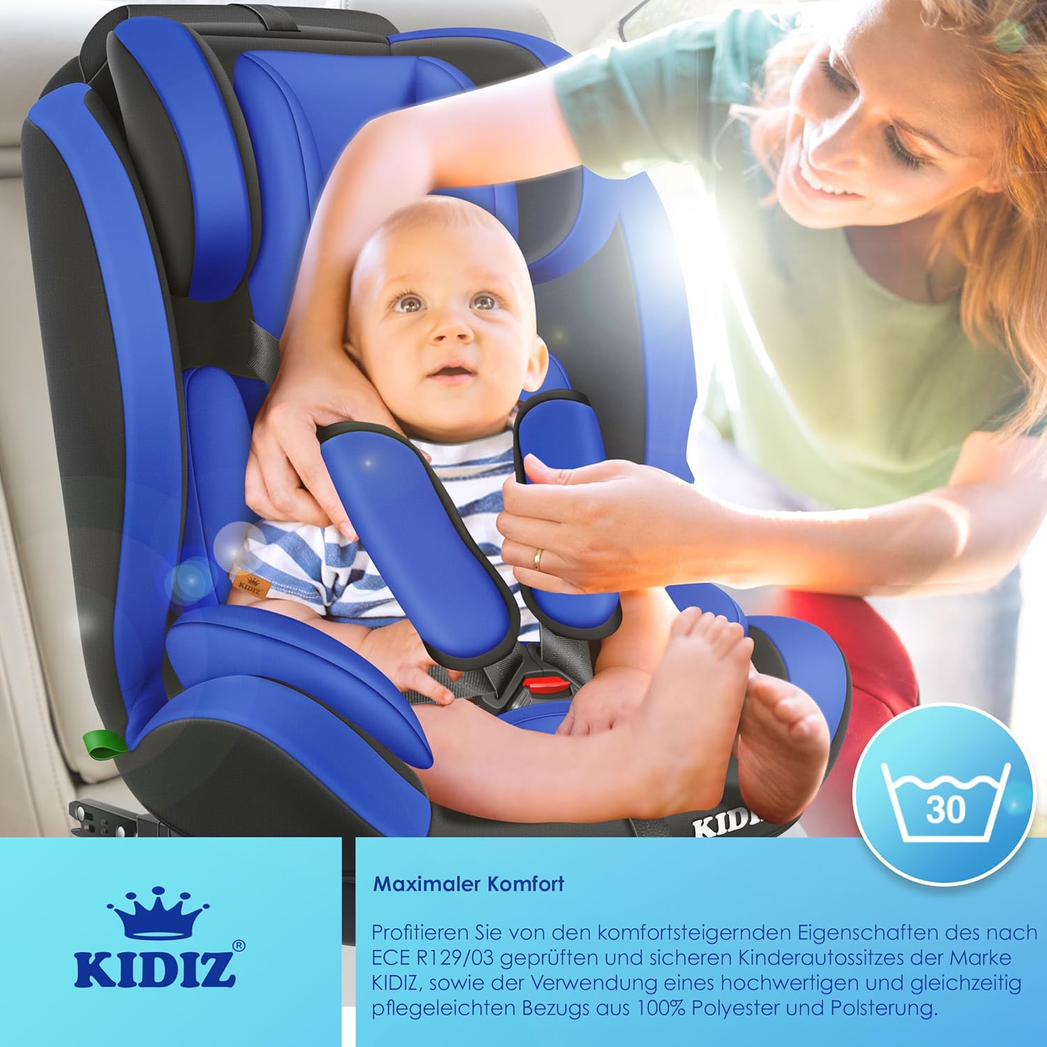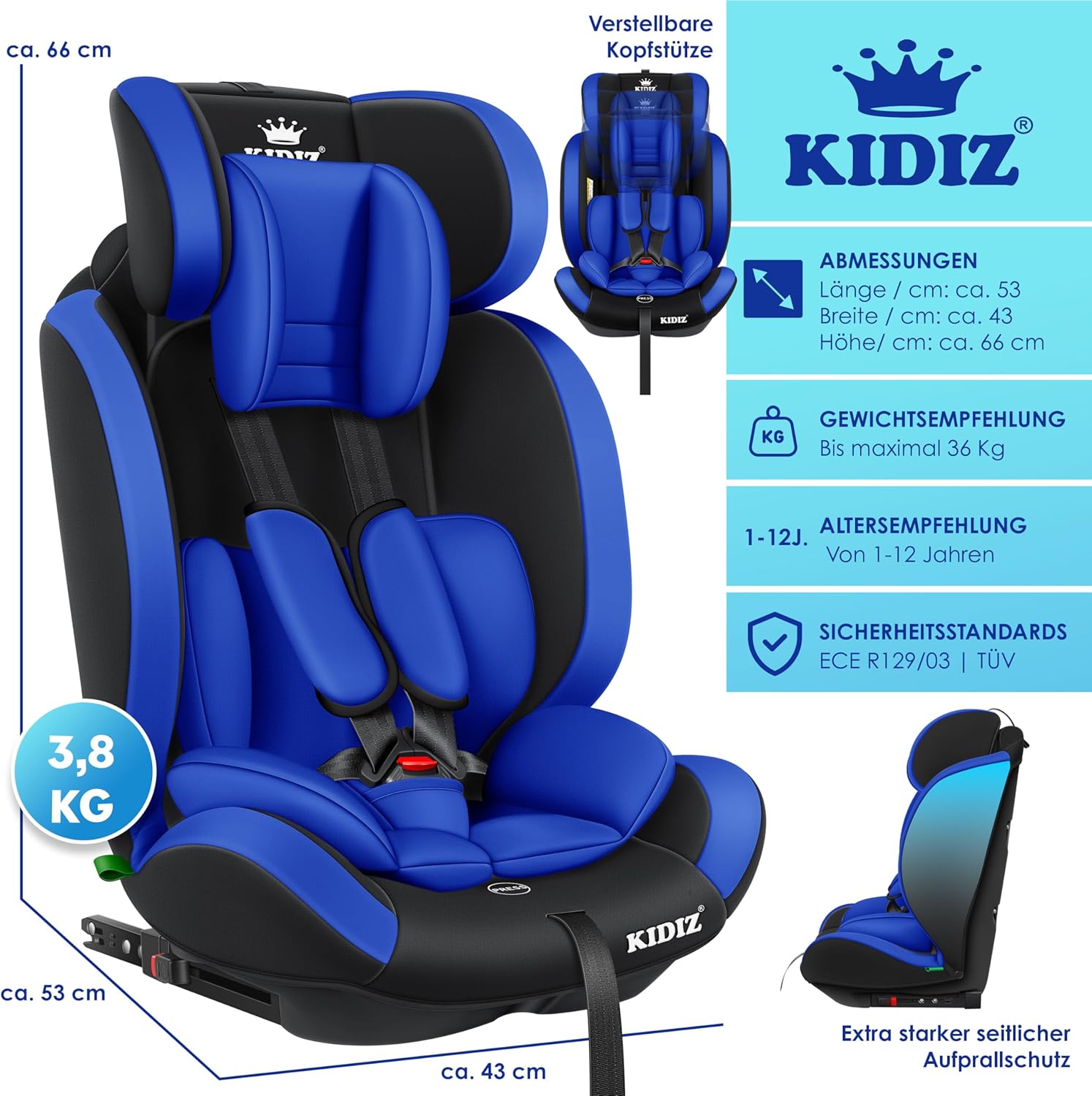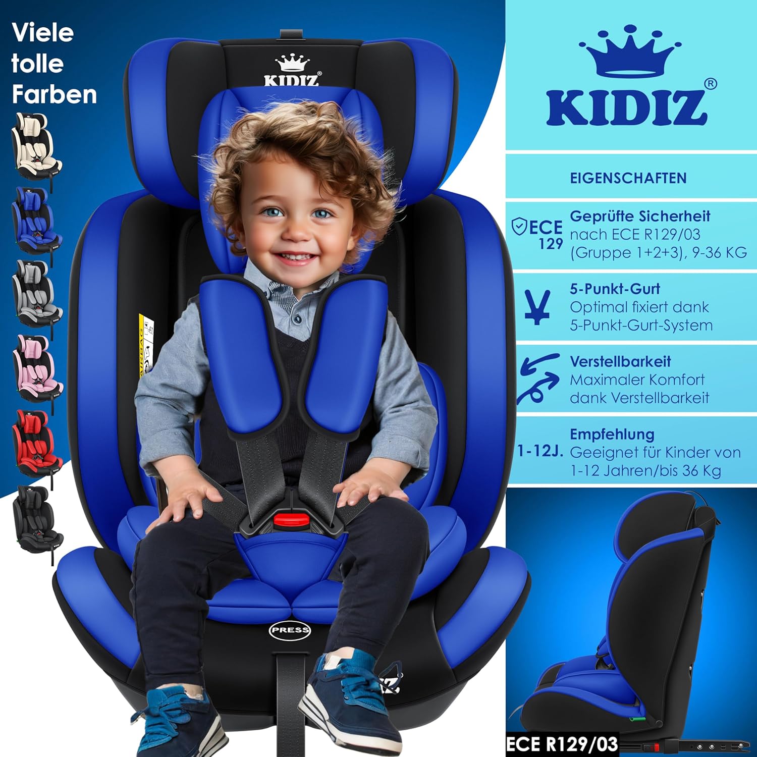 KIDIZ Sportsline autostoel groeit mee met uw kind, optimaal gevormde en gevoerde zitting, snel en eenvoudig schoon te maken. De stoel is getest en goedgekeurd volgens ECE R129/03 (Groep 1+2+3, lichaamsgewicht 9-36 kg – ca. 1-12 jaar).