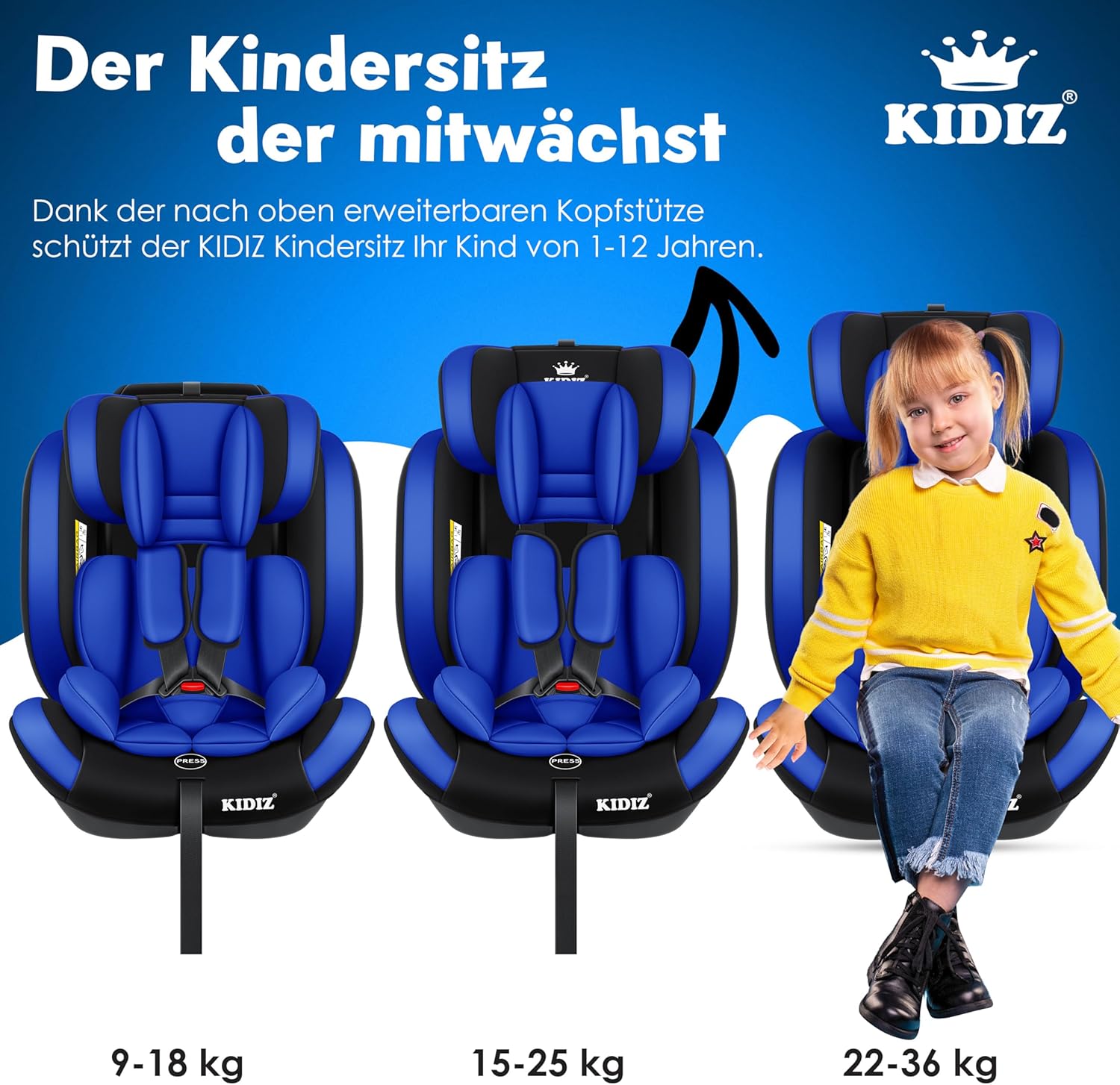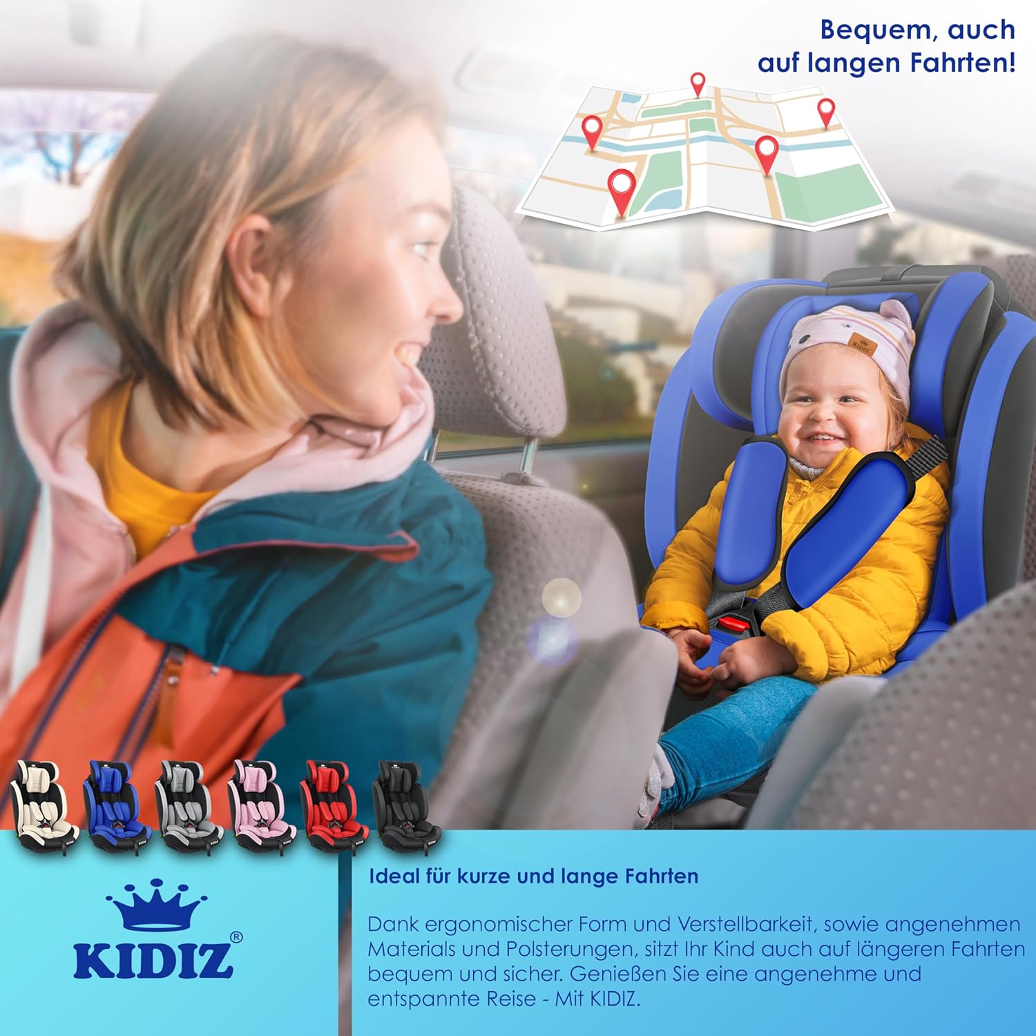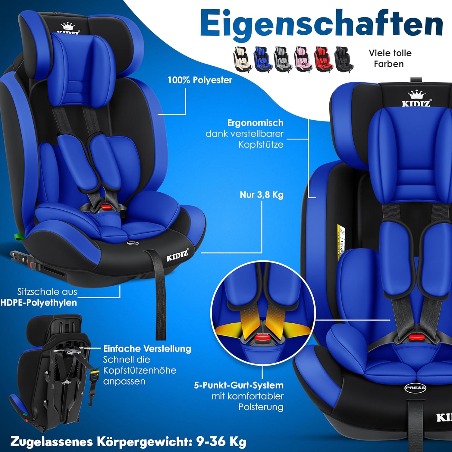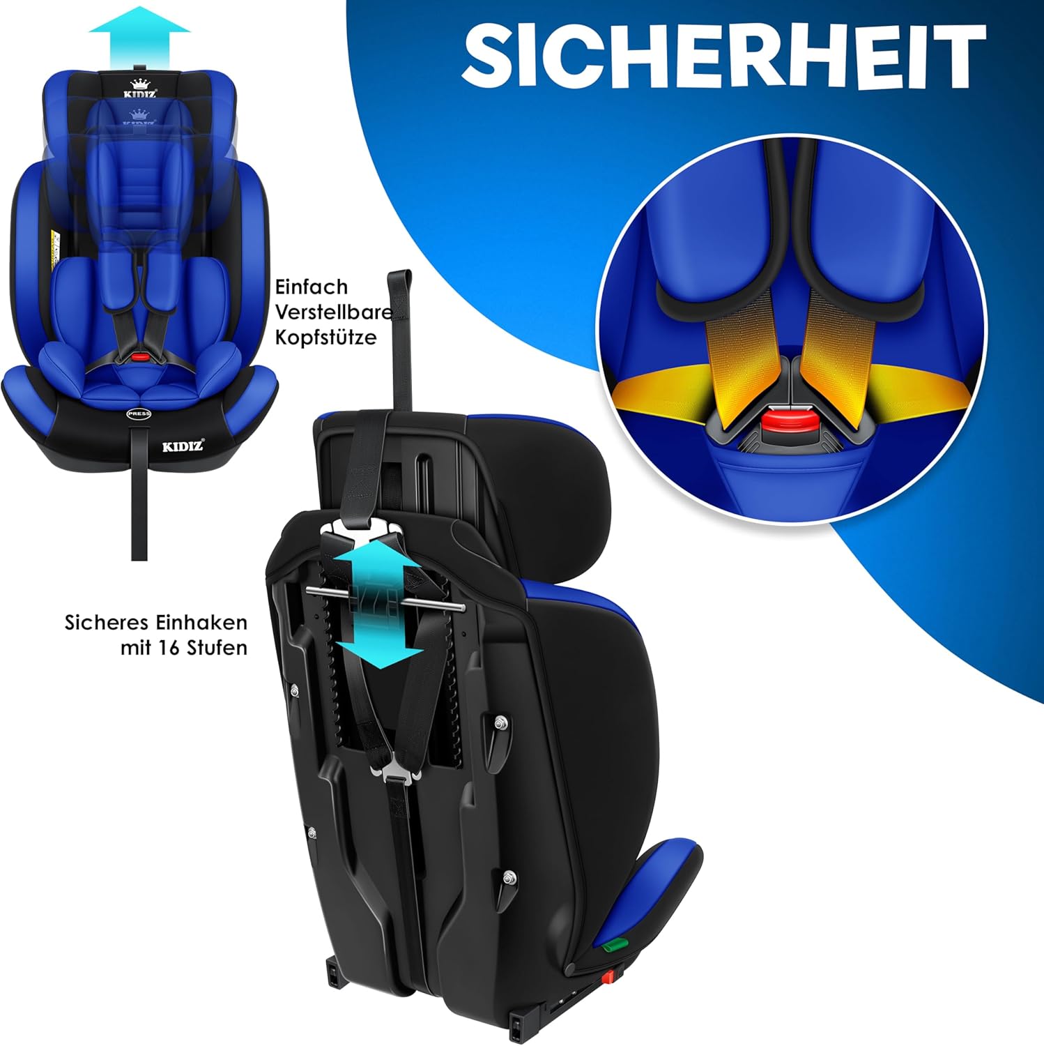 KIDIZ Sportsline autostoel groeit mee met uw kind, optimaal gevormde en gevoerde zitting, snel en eenvoudig schoon te maken. De stoel is getest en goedgekeurd volgens ECE R129/03 (Groep 1+2+3, lichaamsgewicht 9-36 kg – ca. 1-12 jaar).