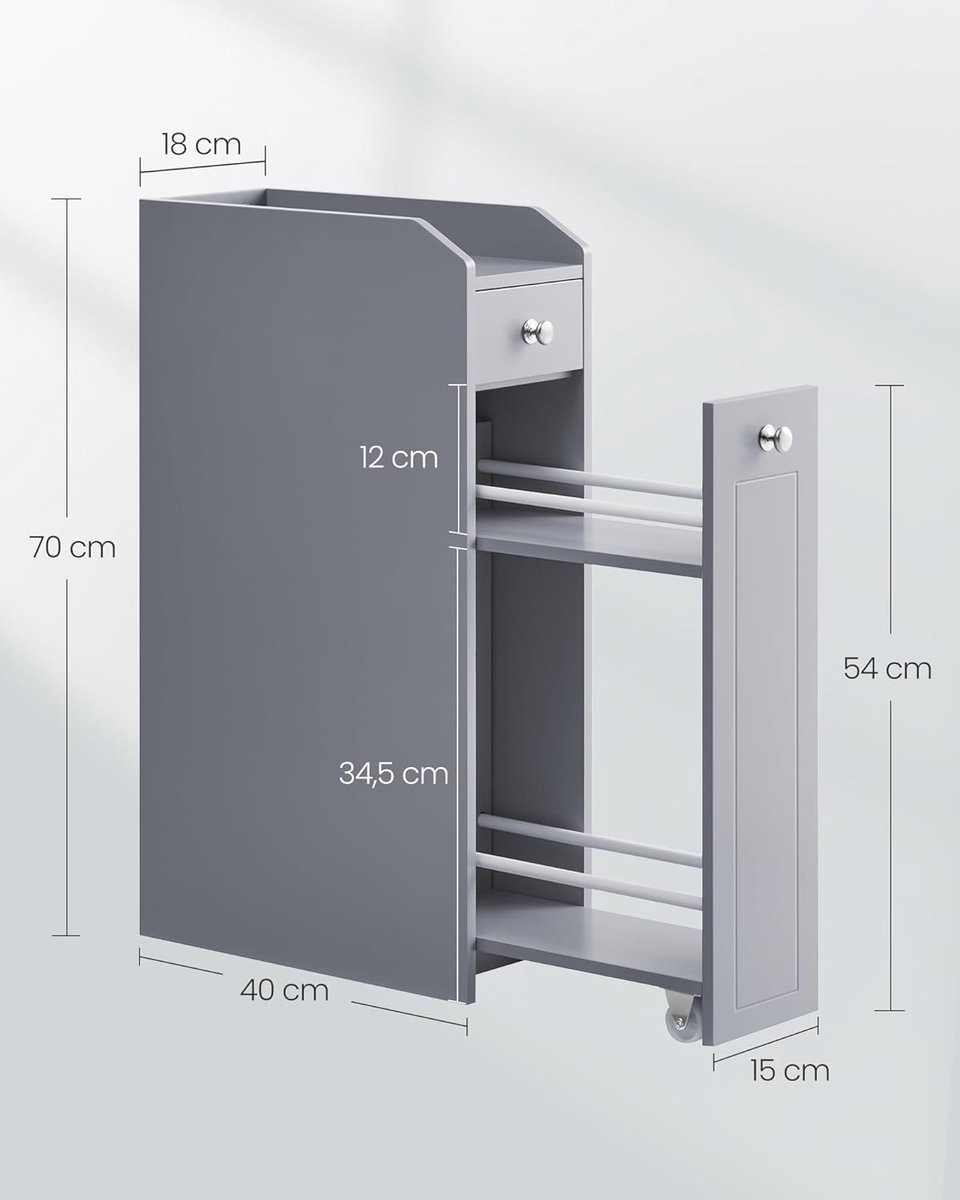 Met een afmeting van slechts 40 x 18 x 70 cm past deze kast moeiteloos in de nis tussen het toilet en de muur, of tussen keukenkasten. Zo creëer je extra opbergruimte zonder veel plaats in te nemen.