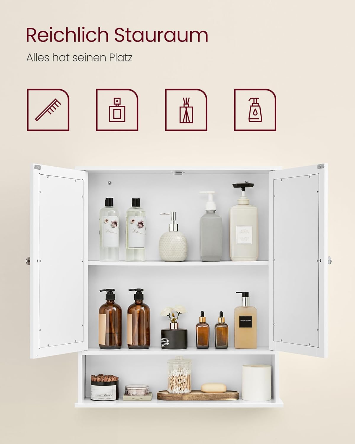 [Verstelbare plank] Maak je geen zorgen dat de grote shampoofles niet in de kast past – de plank achter de deuren is in 3 standen in hoogte verstelbaar, zodat al je spullen, groot of klein, hier een plekje vinden.