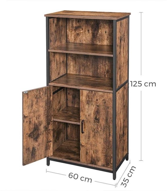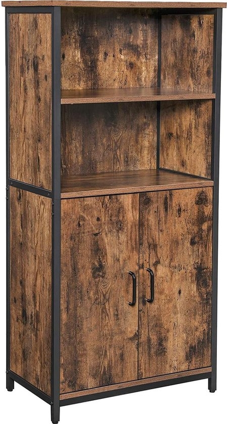 Boekenkast – opbergkast – keukenkast met 2 open vakken – hoogte 125 cm – Plankniveau verstelbaar in kast – vintage bruin-zwart – LSC66BX