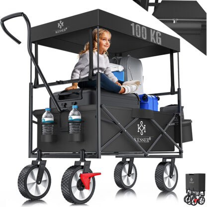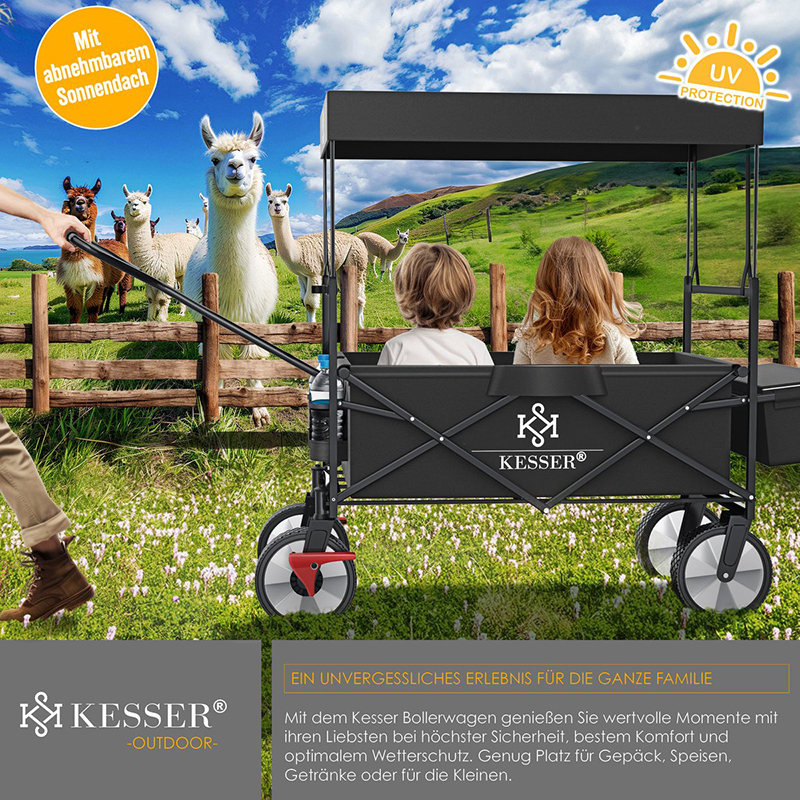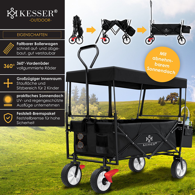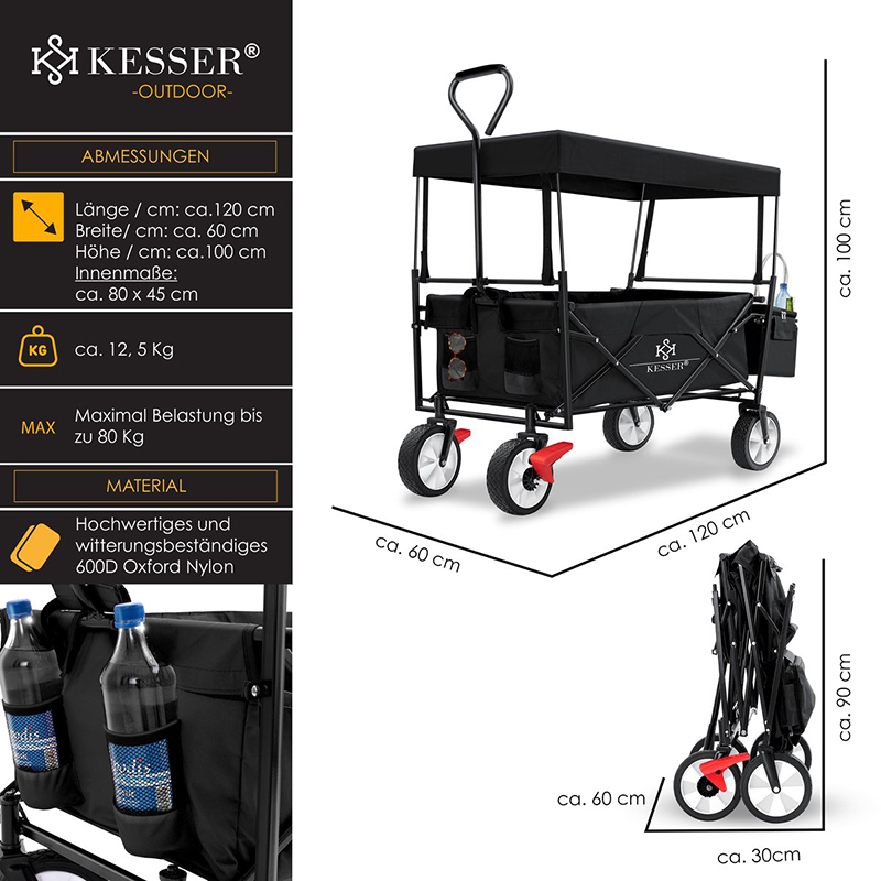 MULTITALENT: Onder de opvouwbare transportwagens biedt deze kar voldoende ruimte voor uitstapjes met de kinderen, festivals of andere vrijetijdsactiviteiten, met zijn laadoppervlak, extra XXL tas aan de achterzijde en diverse houders. Hij kan indien nodig compact worden ingeklapt.