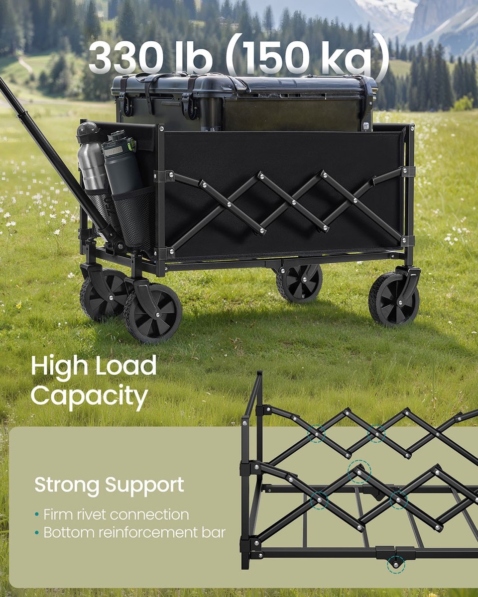 Met stevige klinknagelverbindingen, verstevigde balken aan de onderkant, hoogwaardig staal en 600D Oxford-stof is deze tuinwagen zeer stevig en heeft hij een hoog laadvermogen tot wel 150 kg.
