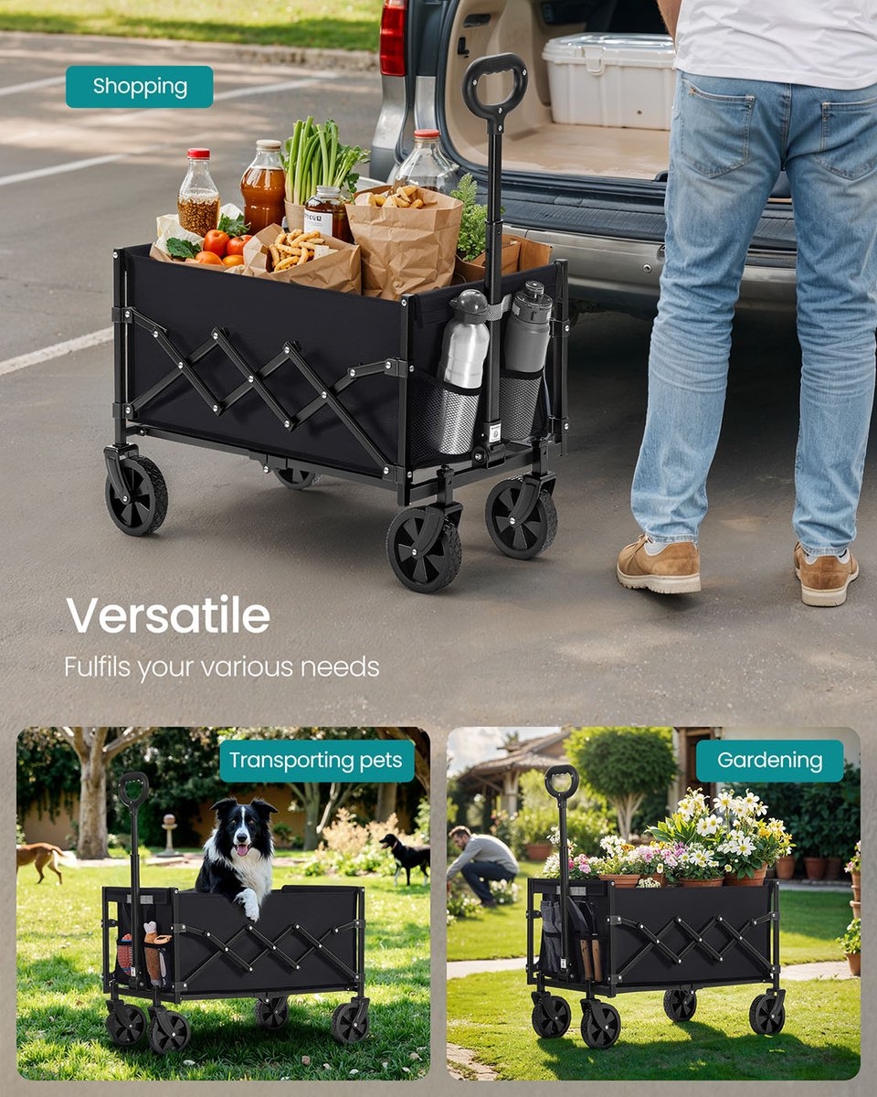 【LICHTGEWICHT & DRAAGBAAR】Met een gewicht van 5 kg is deze opvouwbare kar een fluitje van een cent om te manoeuvreren. De handgreep, bevestigd met klittenband, voorkomt hinderlijk wiebelen bij het verplaatsen van de opgevouwen kar.