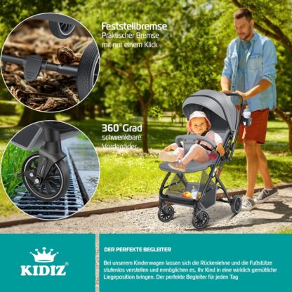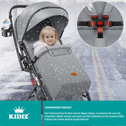 VEILIGHEID EN COMFORT VOOR UW KIND: Onze KIDIZ kinderwagen biedt een veilige en comfortabele rit voor uw kind in elke situatie. De gevoerde 5-puntsgordel zorgt voor maximale bescherming en voorkomt ongewenste bewegingen tijdens de rit. De royaal gevoerde verstelbare rugleuning en voetsteun bieden een ergonomische zitpositie die zich aanpast aan de behoeften van uw kind en comfort biedt, zowel bij het zitten als liggen.