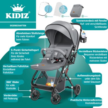 Ontdek de ultieme KIDIZ kinderwagen die veiligheid, comfort en functionaliteit combineert in een stijlvol en doordacht ontwerp. Deze kinderwagen is de perfecte metgezel voor uw dagelijks leven, ongeacht of het zonnig, regenachtig of winderig weer is.