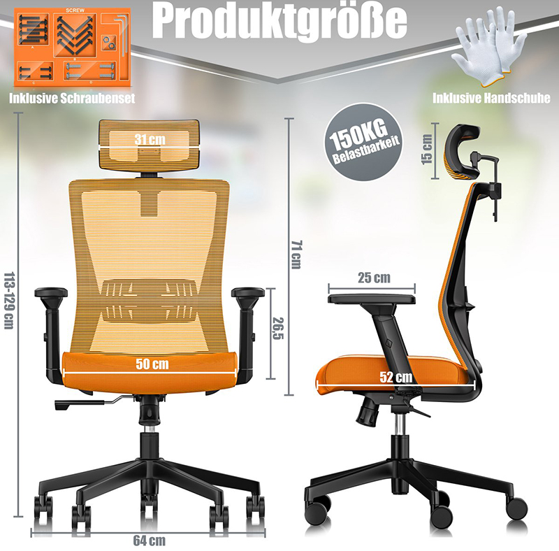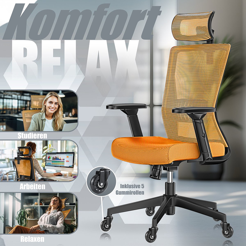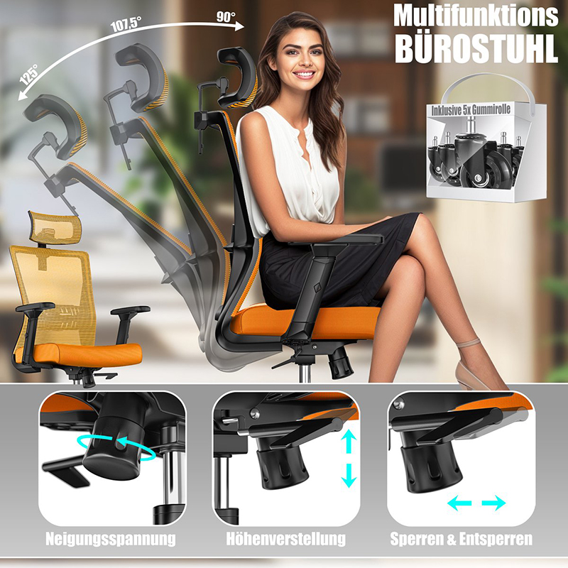 Deze bureaustoel overtuigt met een in hoogte verstelbare zitting, verstelbare lendensteun, kantelbare hoofdsteun, aanpasbare armleuningen, 125° kanteling, stevige rubberen wielen en een draagvermogen tot 150 kg, met eenvoudige montage.