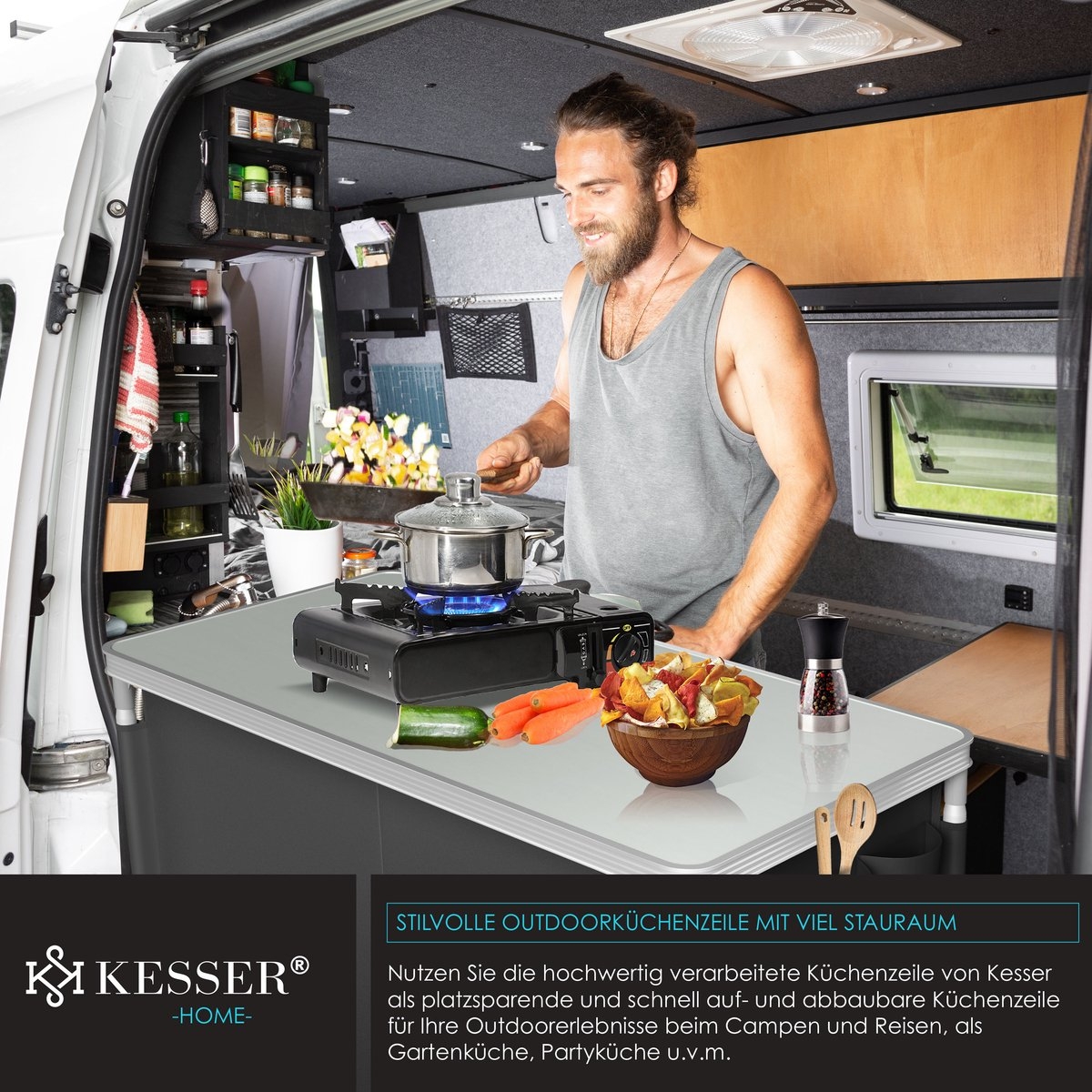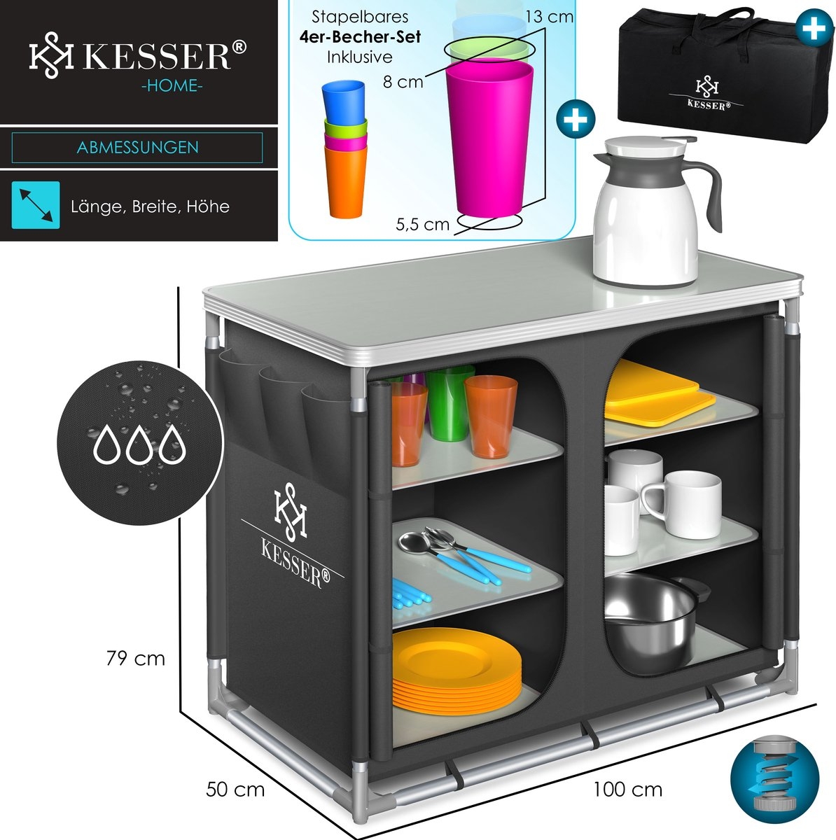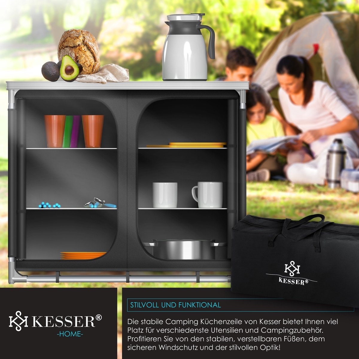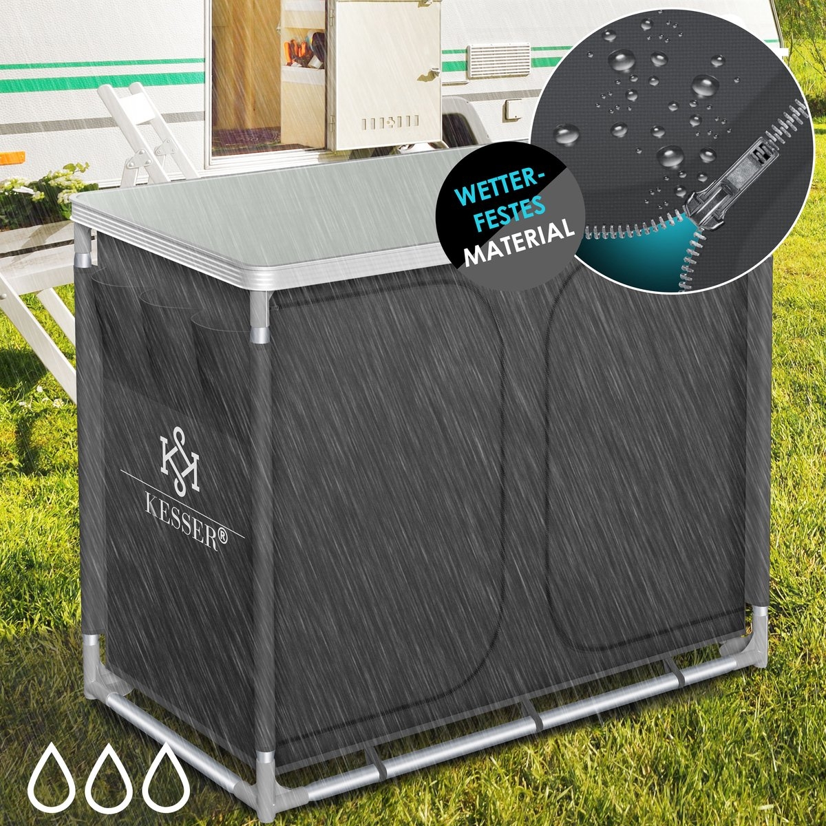 De robuuste campingkeuken met aluminium frame, stoffen inzetstuk en MFD-planken van KESSER!