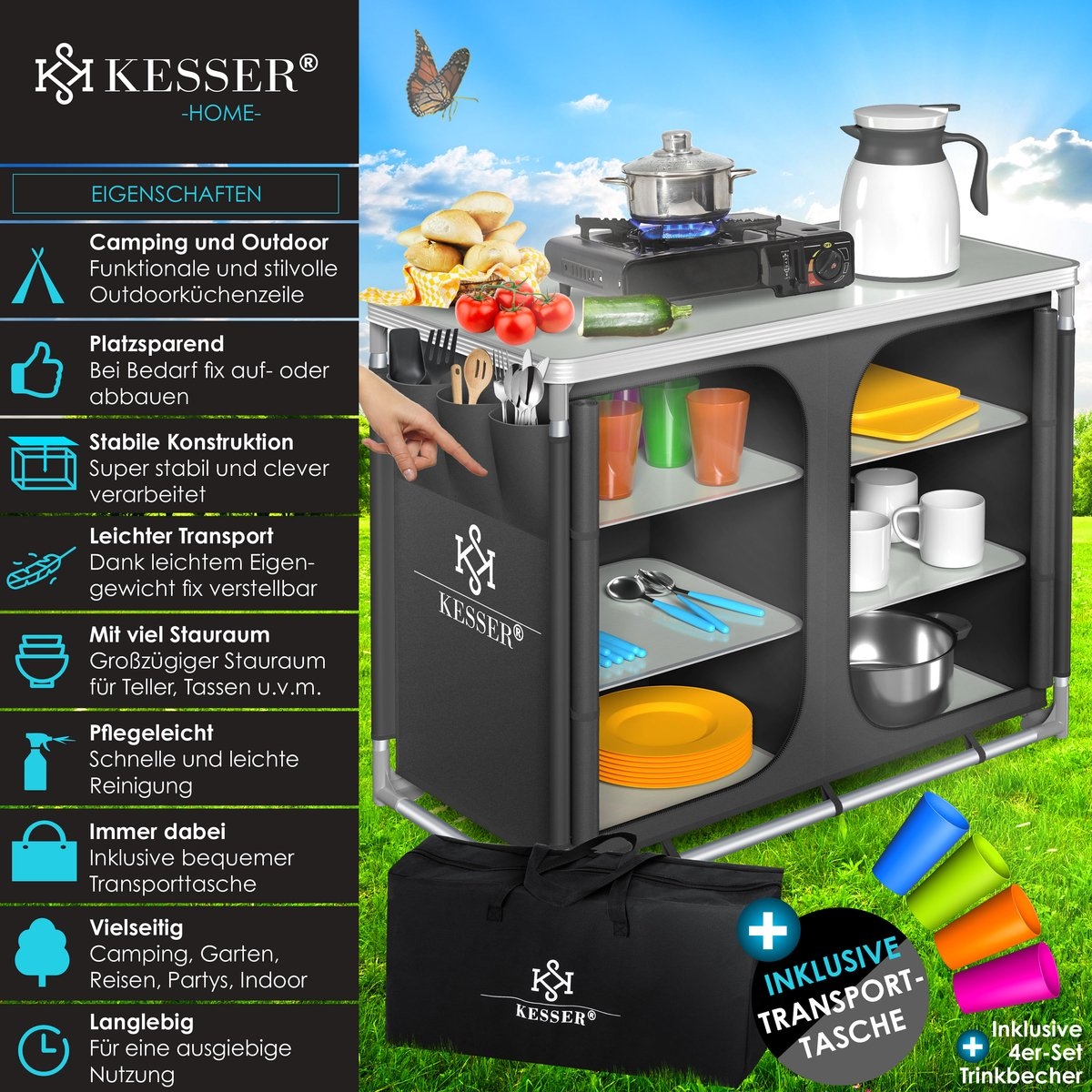 PRODUCTHIGHLIGHTS: Kampeerkeuken voor kamperen en buitenactiviteiten. Ook een praktisch alternatief voor in de tuin of thuis. Deze ultralichte keuken is snel gemonteerd en gedemonteerd en kan ruimtebesparend worden opgeborgen.