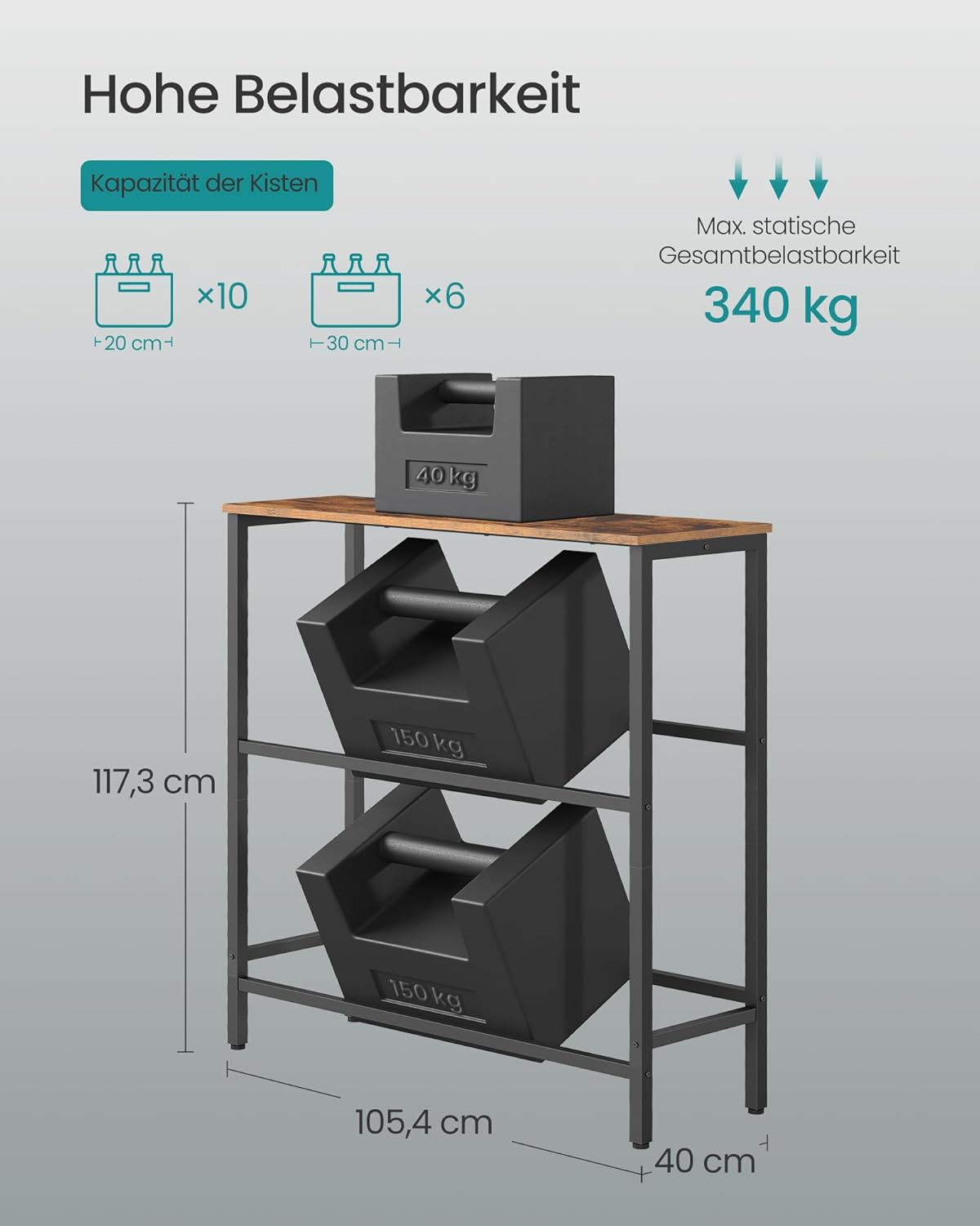Robuuste constructie: Gemaakt van hoogwaardig staal met een frame van vierkante buizen, kan dit rek van 40 x 105,4 x 117,3 cm tot 150 kg per schap dragen en biedt plaats aan in totaal 6 kratten.