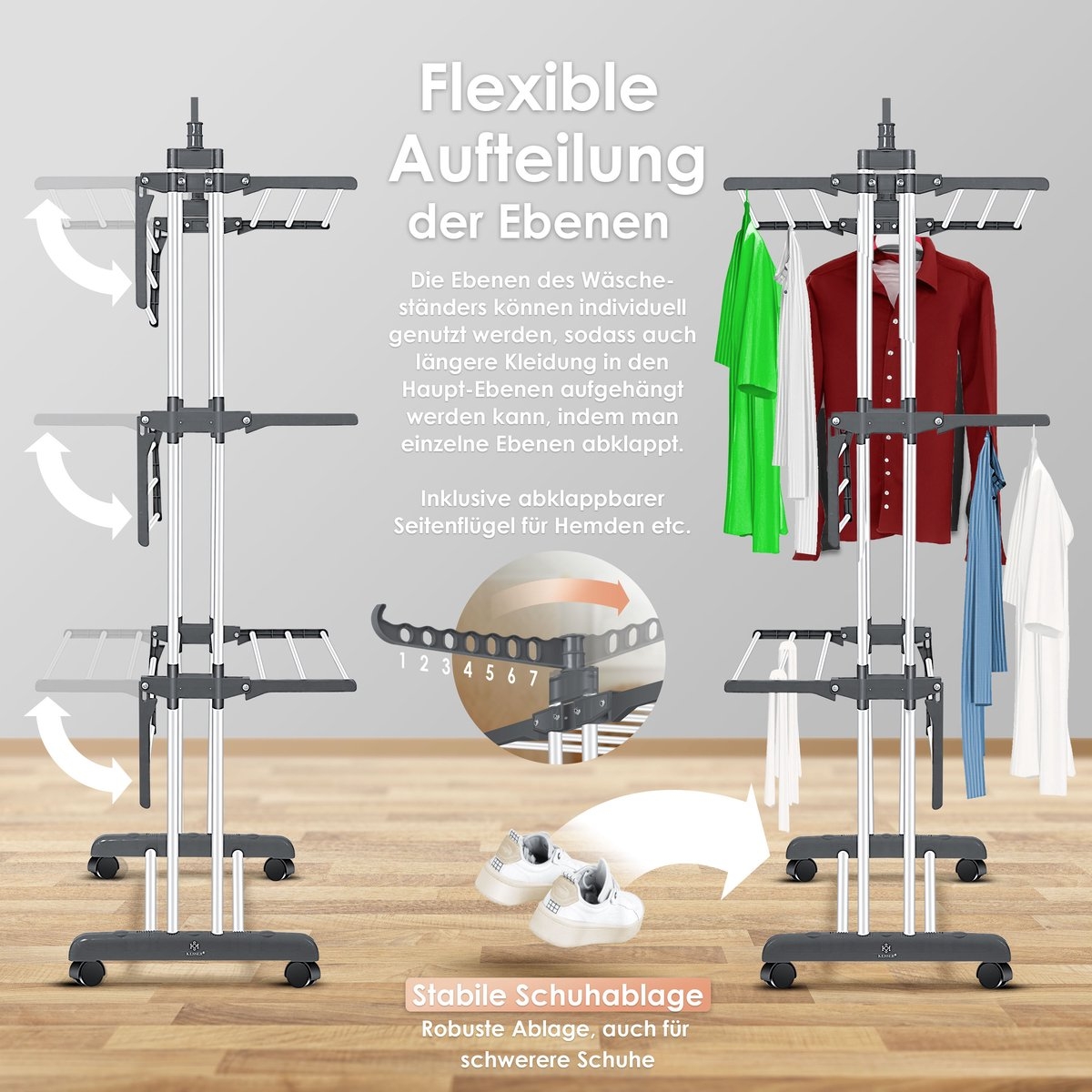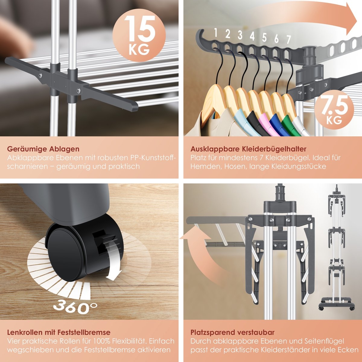 Waskledingrek inklapbare zijvleugels, ruimte voor 14 kledinghangers, ruimtebesparing, draagvermogen 50 kilogram, solide dubbele kolommen, 360°-wielen met rem, flexibele niveaus, 12 gekleurde wasknijpers, ruime planken, inklapbare kledinghangerhouders