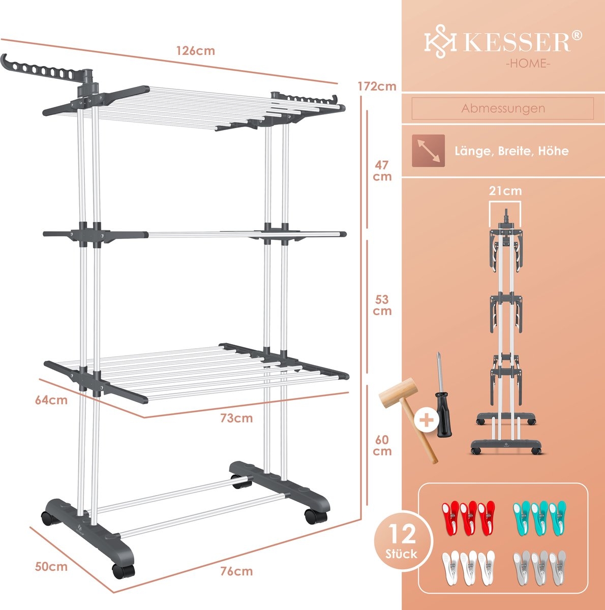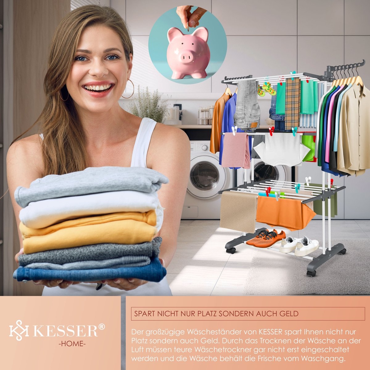 PRAKTISCH EN RUIMTEVOORZIENEND: Het KESSER droogrek biedt je royale ruimte voor het drogen van maximaal 62 kledingstukken en een indrukwekkend laadvermogen van 50 kilo. Met uitklapbare zijvleugels en ruimte voor 14 hangers, maximaliseert hij je wascapaciteit terwijl hij toch ruimtebesparend en gemakkelijk op te vouwen blijft.