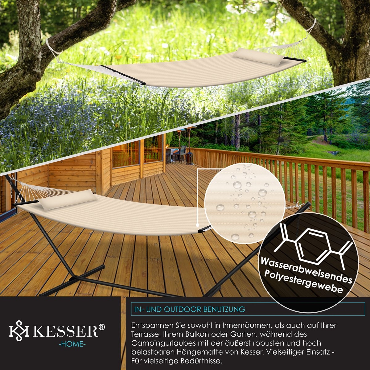 DUURZAAM EN EENVOUDIG ONDERHOUD: Ontspan zowel binnen als buiten met de extreem robuuste hangmat van KESSER.Dankzij de waterafstotende polyester stof kun je de hangmat zelfs bij slecht weer in de tuin laten liggen.Het materiaal zorgt ervoor dat water op het oppervlak parelt, waardoor het snel en gemakkelijk droogt of uitdroogt voor het volgende gebruik.reinigen.