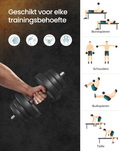[Flexibel gebruik] Totaalgewicht met accessoires: 20 kg, inclusief 4 x 2,5 kg schijven, 4 x 1,25 kg schijven, 4 x 1 kg schijven, 2 halterstangen, 4-sterrenvergrendelingen en een halterstang voor 2 x 10 kg halters of een halterstang van 20 kg.