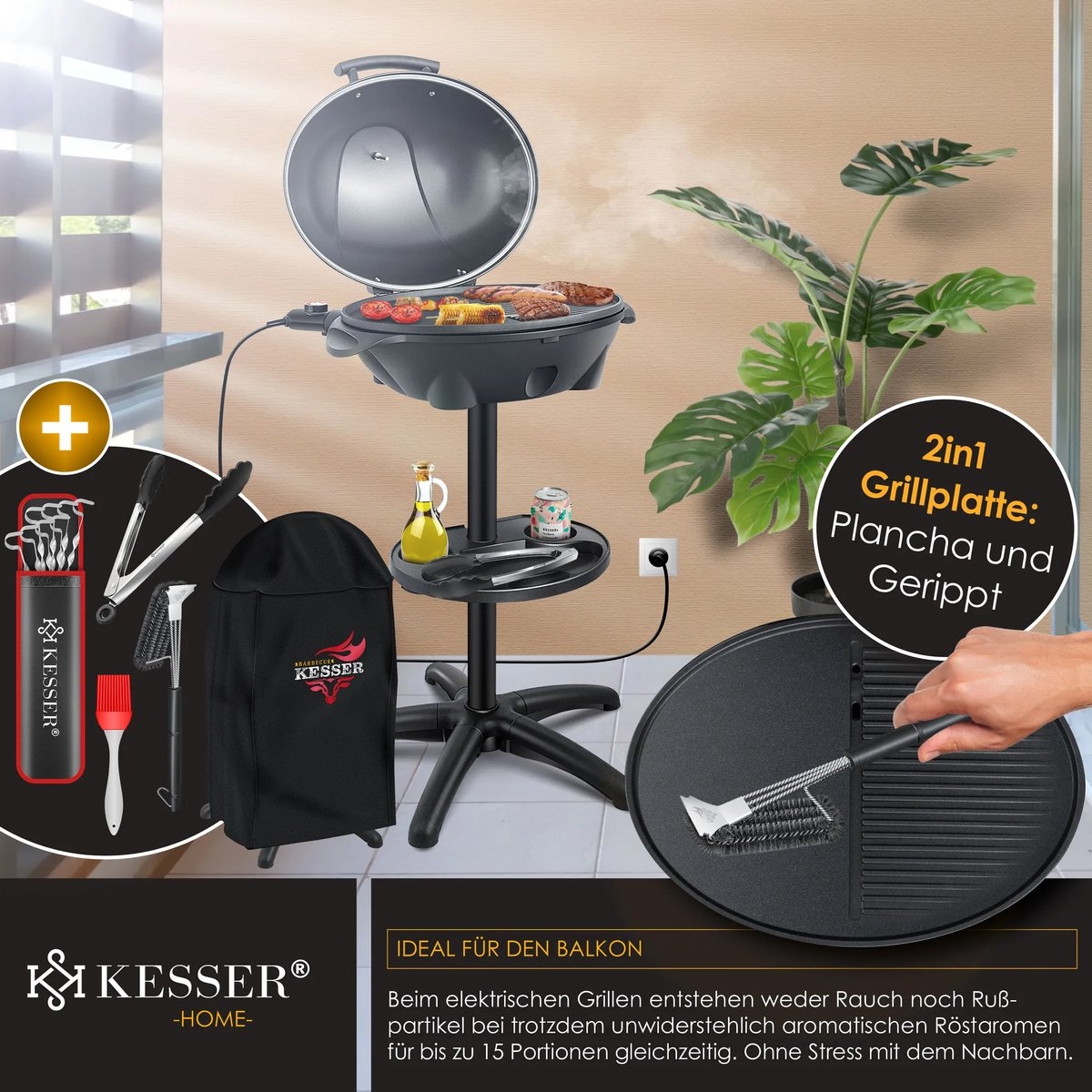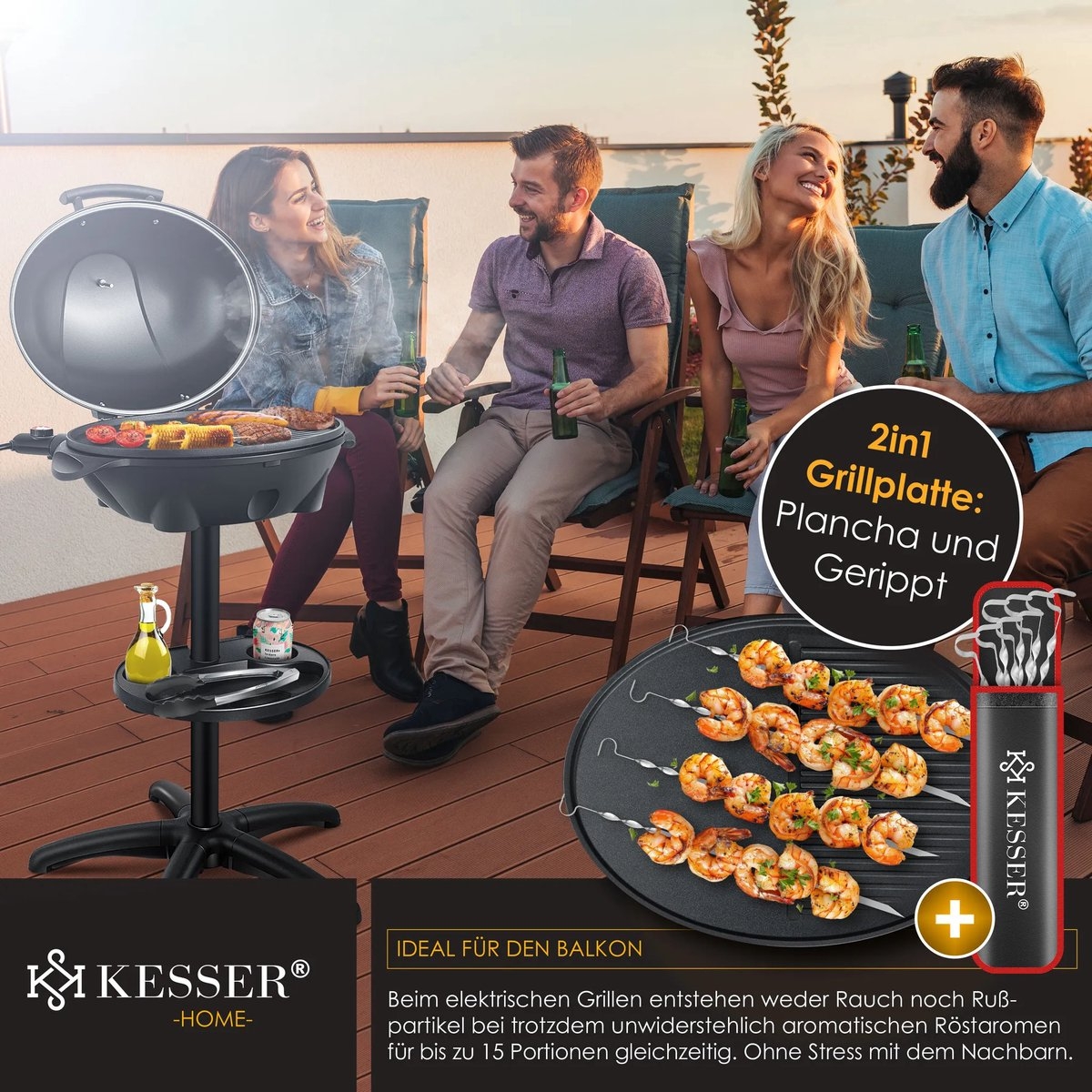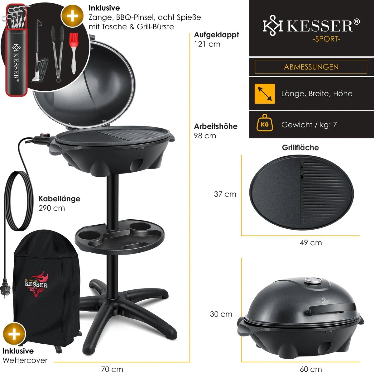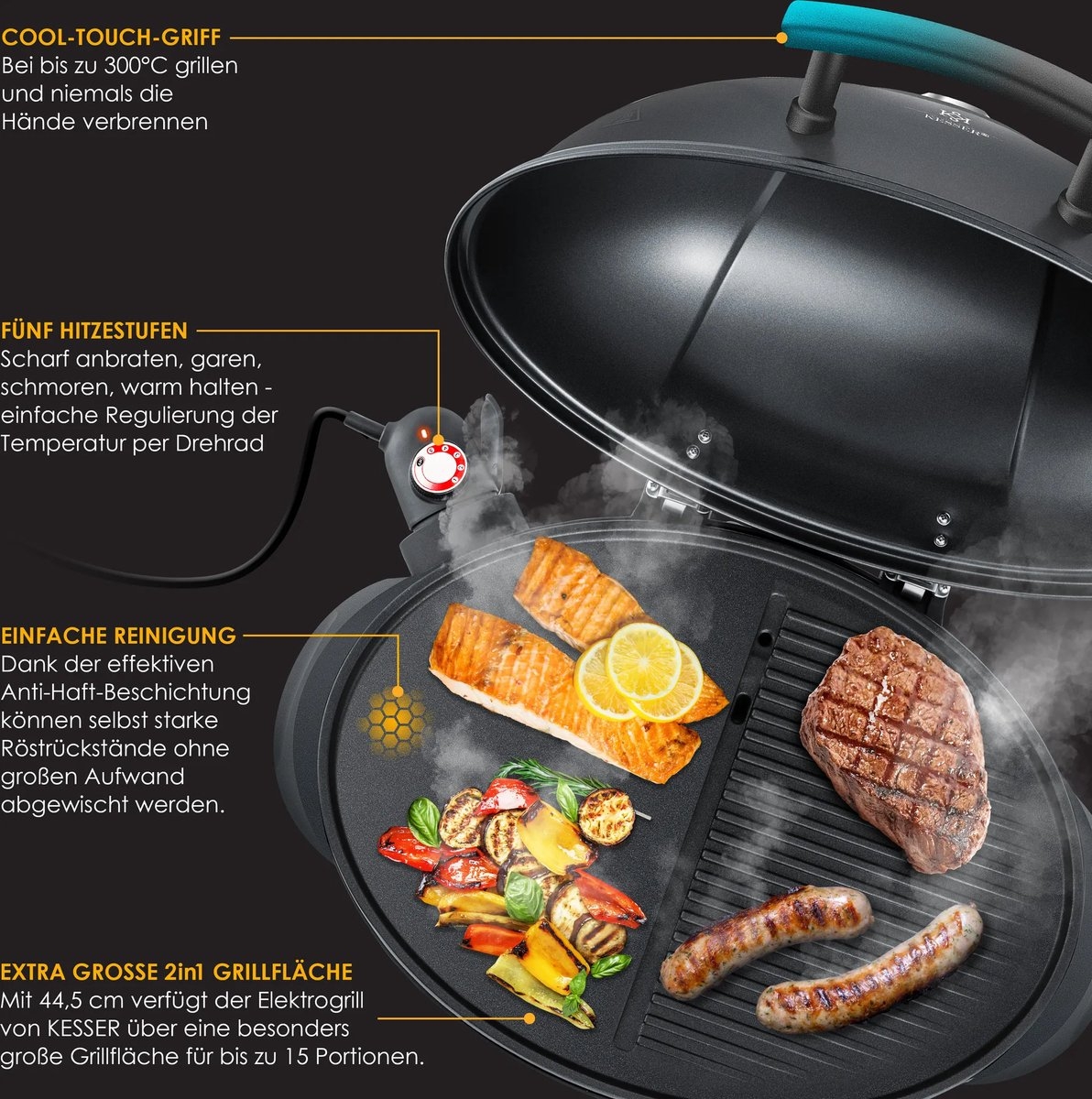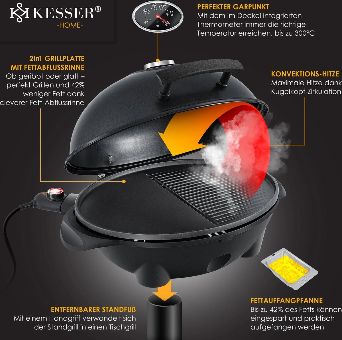 De elektrische grill van KESSER biedt met de XXL grillplaat 49cm x37 cm biedt voldoende ruimte voor gegrilde gerechten voor maximaal 15 personen . Dankzij de grote kap met bijzonder veel volume past er zelfs een flinke roastbeef van 3 kg onder en zelfs de altijd populaire kip in blik kunt u probleemloos onder de kap grillen . Bovendien kan dankzij de kap een bijzonder mals grilleffect worden bereikt zonder dat het eten uitdroogt , terwijl er een heerlijk korstje ontstaat – zo blijven de smaak , samenstelling en vorm van het gegrilde voedsel zo goed mogelijk behouden . Bovendien is de XXL-grillplaat voorzien van een antiaanbaklaag voor eenvoudige reiniging , een vetopvangbak voor een vetarme grillervaring en een geribbeld en glad grilloppervlak . De grillplaat met antiaanbaklaag kan voor reiniging worden verwijderd . In tegenstelling tot andere kogelbarbecues is bij de KESSER kolombarbecue alles net iets groter . De werkhoogte van onze kogelbarbecue bedraagt ​​een comfortabele 98 cm – met de kap open is deze zelfs 121 cm . Het design van de KESSER BBQ is daardoor indrukwekkend en een echte blikvanger op elk barbecuefeest . Met een vermogen van circa 2400 watt wordt in korte tijd een grilltemperatuur van maximaal 300 °C bereikt , die u bovendien eenvoudig kunt regelen via de in het deksel geïntegreerde thermostaat . Zelfs een braadstuk van 3 kg past onder de grote kap en kan met behulp van de temperatuurinstelling langzaam worden gegaard tot het van binnen mooi roze en mals is.