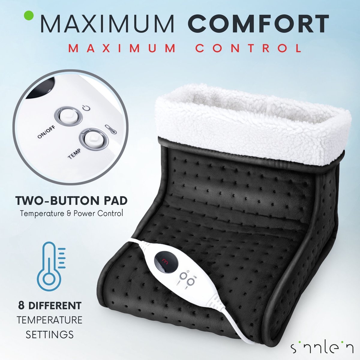 - ALTIJD AAN DE VEILIGE KANT: De voetenzak heeft een geïntegreerde automatische uitschakelaar na ca. 90 minuten en een oververhittingsbeveiliging die de hoogste veiligheid biedt.