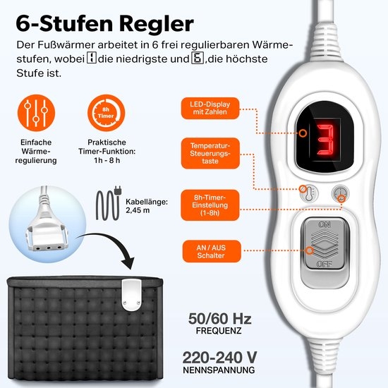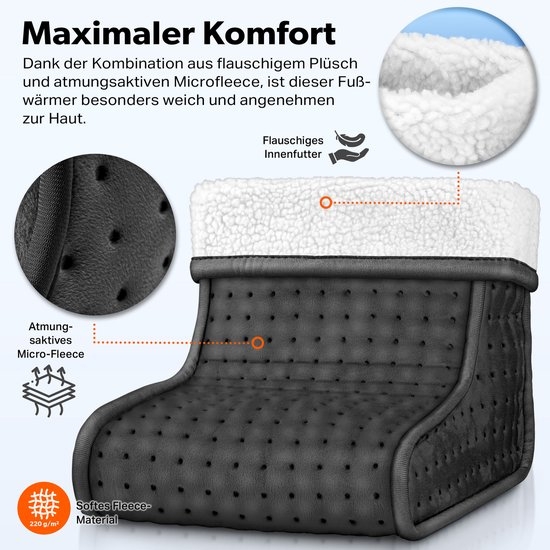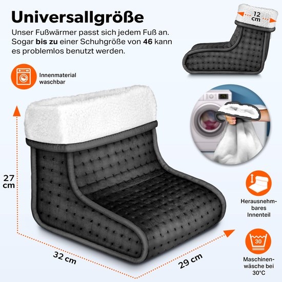 - EENVOUDIG TE REINIGEN & TIMER: Voetenwarmer van micro-pluche met zacht, aangenaam binnenvoering dat wasbaar is op 30°. Dankzij een timer van 90 minuten is een automatische uitschakeling gegarandeerd.