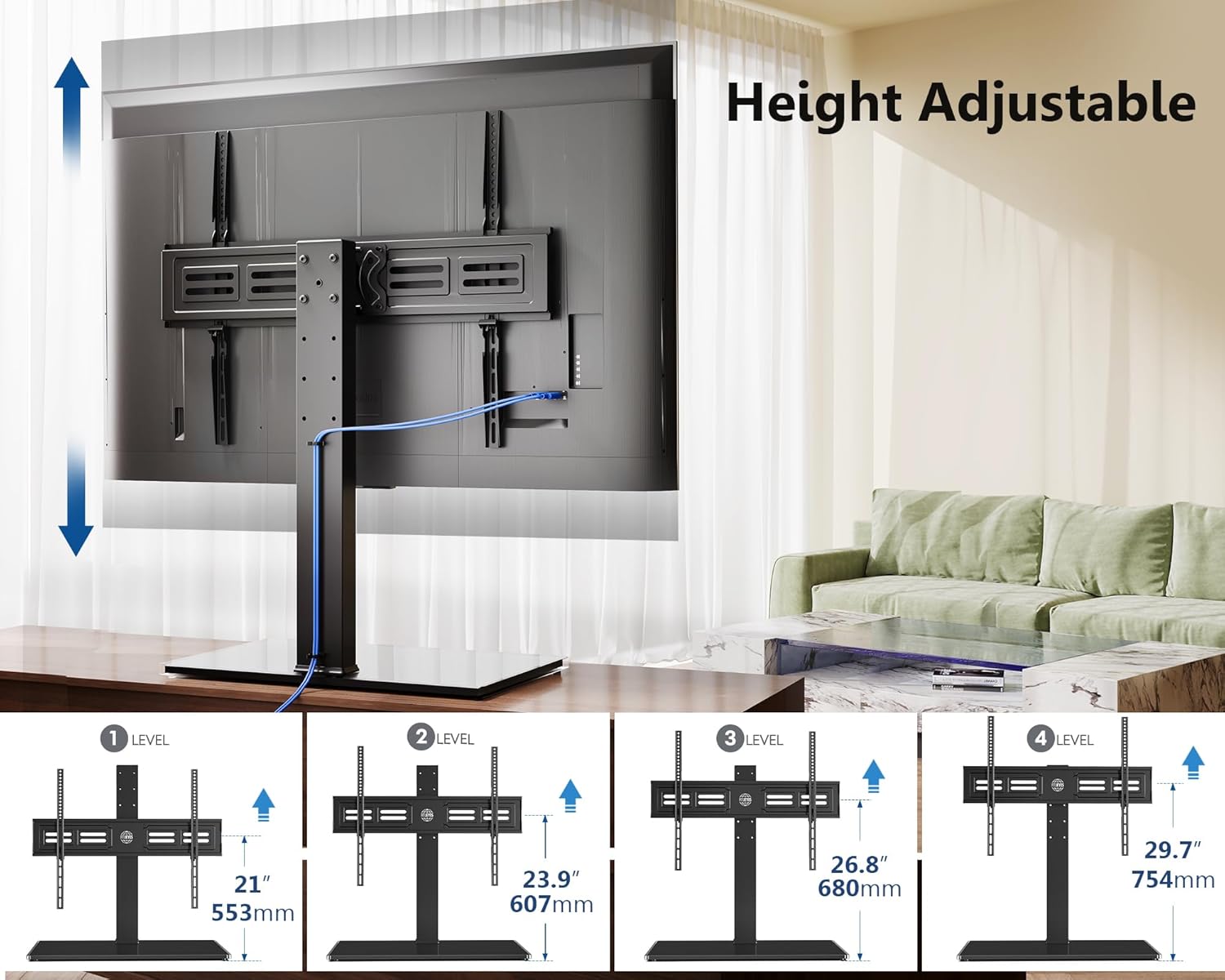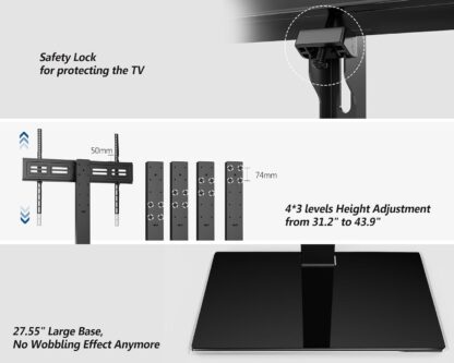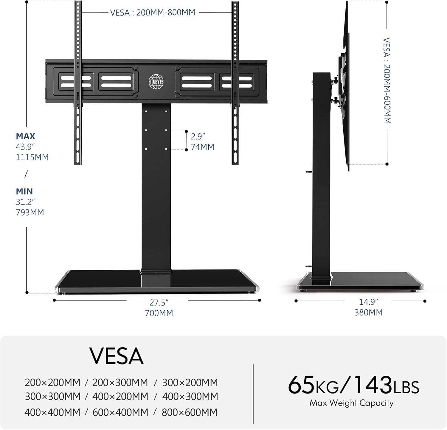 FITUEYES 50-85 inch TV-standaardbasis: een universele TV-standaardbasis met beugel om uw TV en AV-componenten op een entertainmentcenter of een bureau/tafel te plaatsen. De slanke, 10 mm dikke en grotere basis van gehard glas biedt plaats aan uw kabel-tv-box, satellietontvanger, spelconsoles en is compatibel met PS4, Xbox of Apple TV. Deze stevige tv-standaard is dus een onmisbare hulp voor uw tv.