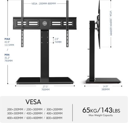 Het universele tv-standaardontwerp van FITUEYES past op de meeste 50-85 inch LCD/LED/Plasma-tv’s op de markt tot VESA 800 x 600 en weegt tot 65 kg. Geschikt voor VESA 800×600, 700×600, 800×400, 700×400, 600×400, 400×400, 400×300, 400×200, 300×300, 200×200). Controleer de VESA (het bevestigingsgatenpatroon achter de tv), eventuele geblokkeerde kabel/ingang en het gewicht van de tv voordat u deze tafel-tv-standaard koopt.
