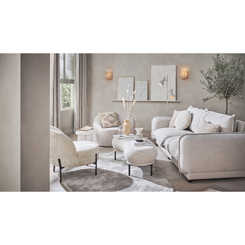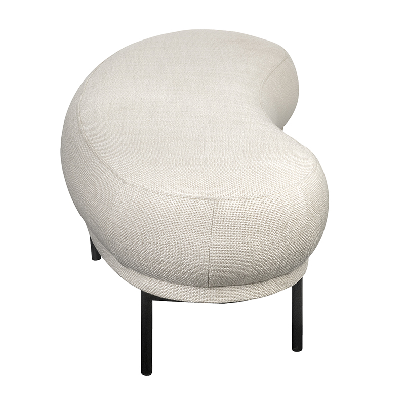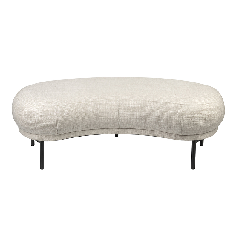 Gestoffeerd bankje met een zachte crème bekleding en zwarte poten.