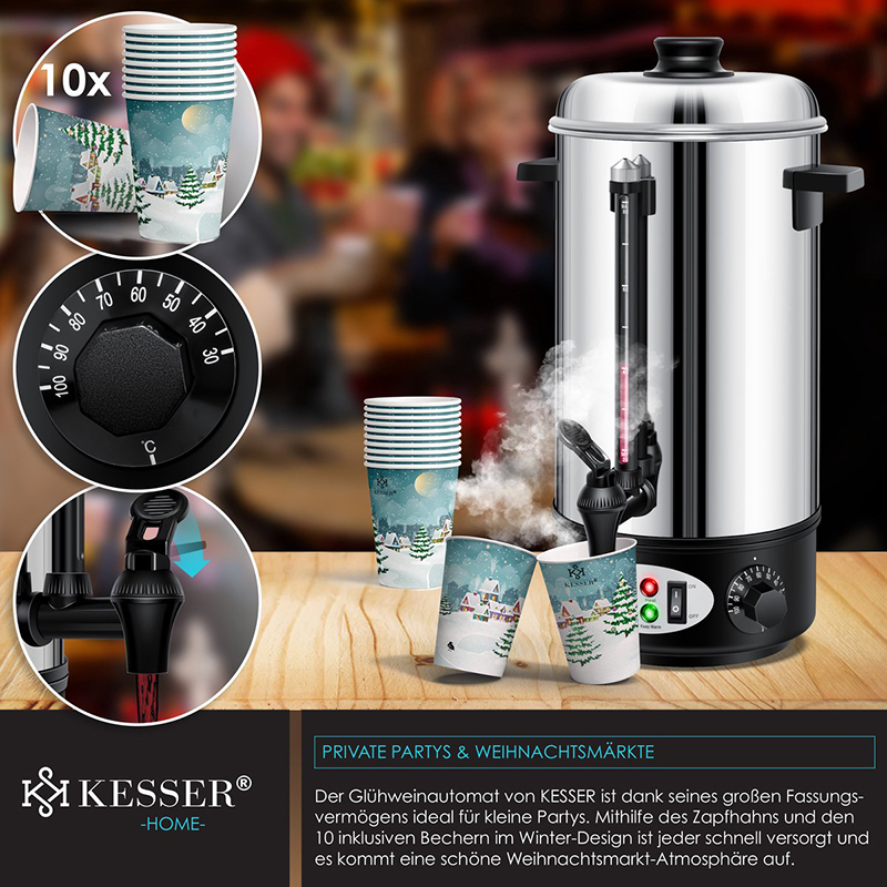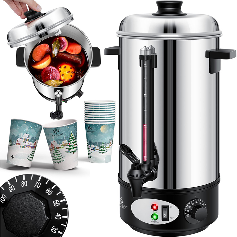 Met de KESSER KEG1800 kun je eenvoudig en snel al je drankjes verwarmen en warm houden. Gewoon vullen metwater, thee, koffie of glühwein.Ook soepen en andere vloeistoffen kun je in een handomdraai opwarmen en warm houden. Dankzij de roestvrijstalen behuizing blijven er geen smaken aan de container plakken.Warme dranken dispenser ideaal voor kleine bijeenkomsten en vieringen met vrienden en familie en zelfs voor het ontvangen van kleine groepen. Ideaal voor de kerstmarkt of voor je feestje thuis.