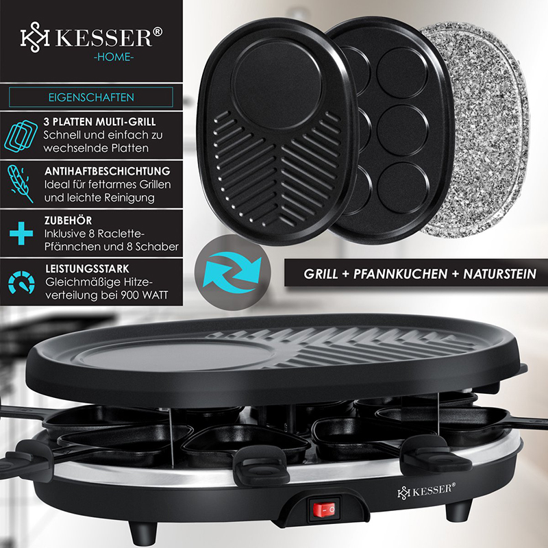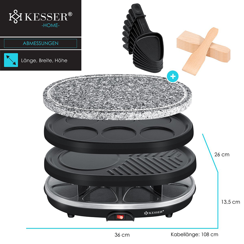 Raclette-grill met 900W vermogen, incl. 8 raclettepannetjes en 8 schrapers en gelijkmatige warmteverdeling, antiaanbaklaag en natuurstenen plaat.