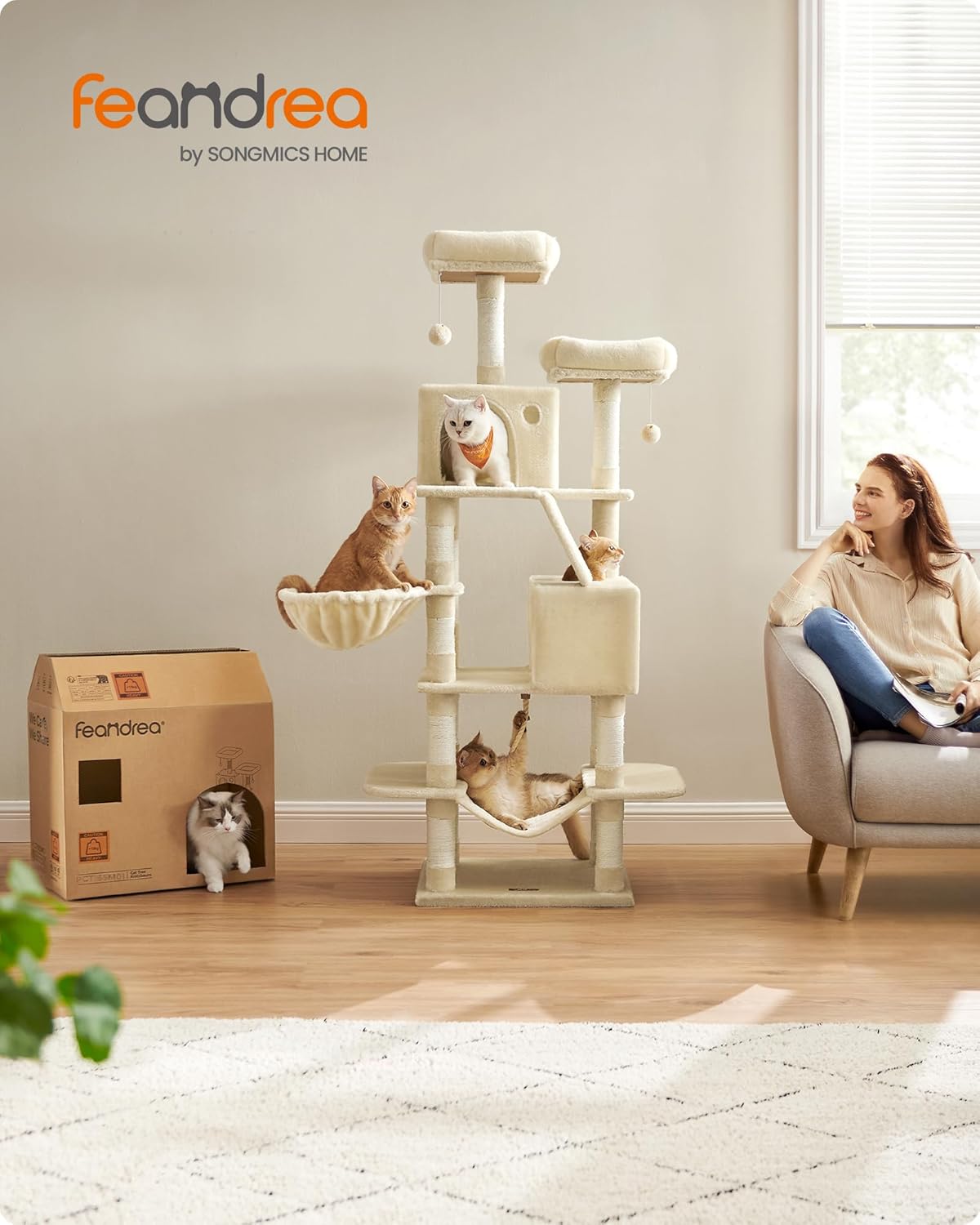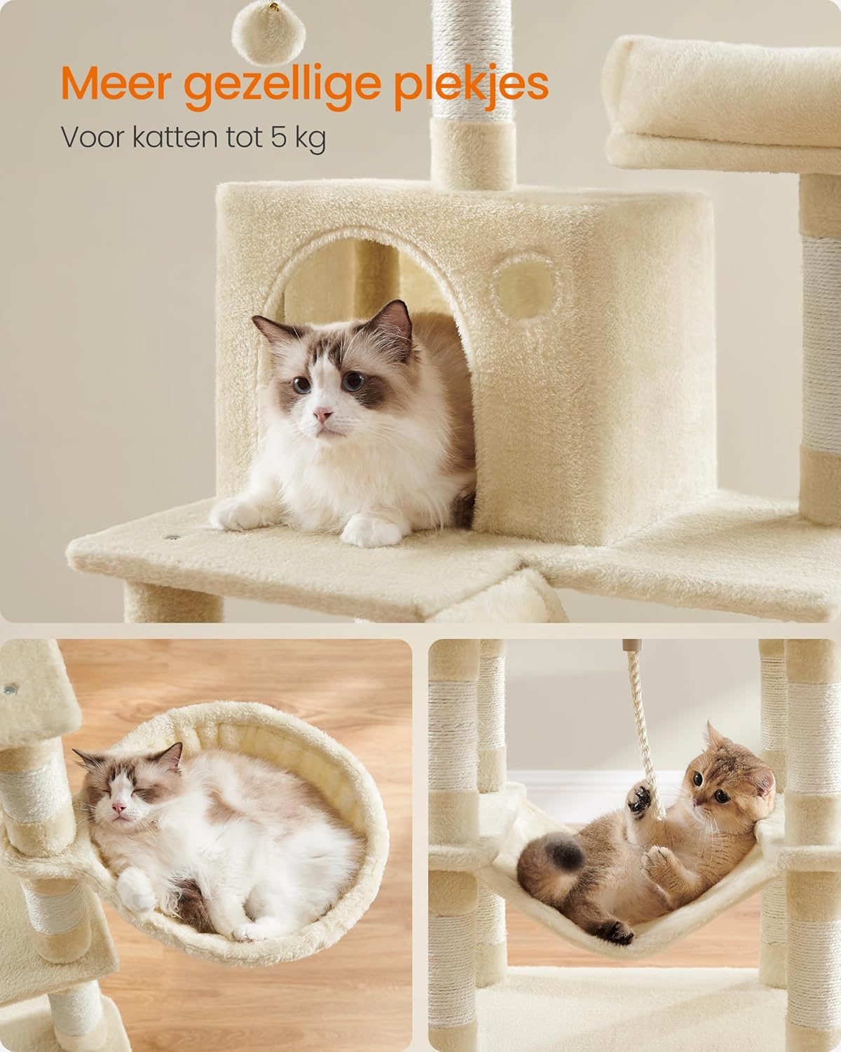 [Alles-in-één speeltuin] 2 goed beklede platforms, 2 gezellige grotten, 1 zachte mand, 2 pluche ballen en 1 hangmat – elke kat vindt een favoriete plek op deze kattenboom met meerdere verdiepingen – perfect voor huishoudens met meerdere katten.
