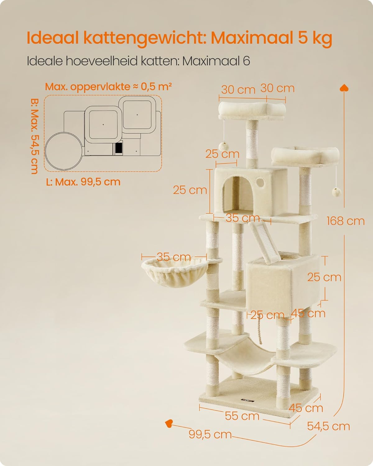 168 cm hoog. 5 niveaus. Korte afstanden van 25-30 cm tussen de treden. Deze krabpaal is gemakkelijk op en af te stappen en is perfect voor katten die graag klimmen en hoog willen komen.