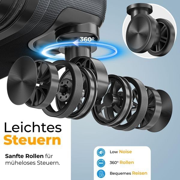 FLEXIBEL EN MOBIEL: Voor maximale mobiliteit heeft de koffer een praktische telescoopstang. Je kunt de stang gemakkelijk uitschuiven en de koffer comfortabel achter je aan trekken. Met de robuuste 360° massief rubberen banden kan de koffer moeiteloos over allerlei routes worden gerold, zelfs op oneffen oppervlakken. Met zijn deelbare interieur biedt hij maximale flexibiliteit en organisatie voor je reizen.