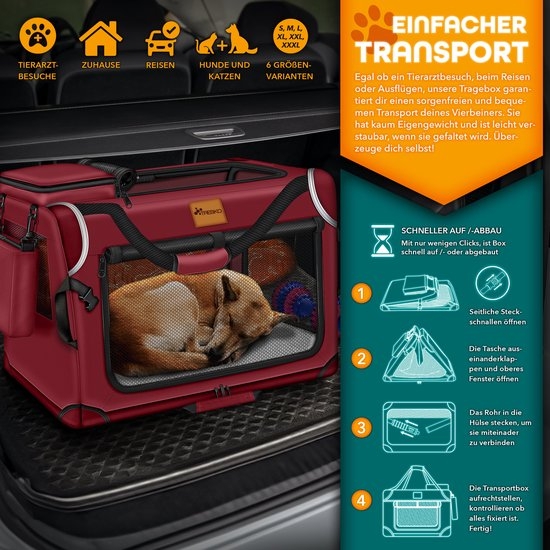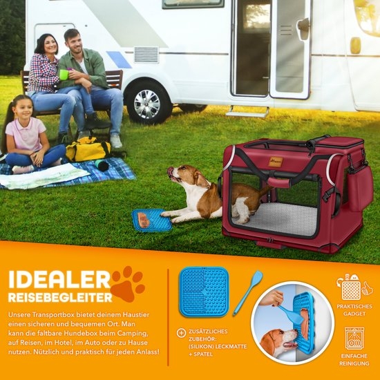 POLIJST & PERFECT GEBRUIKSVRIENDELIJK: De hondentransportbox kan veilig in de auto worden vastgezet met twee riemen. Twee stevige zijflappen en een gordelgeleider zorgen hiervoor. Onze box is ideaal voor op reis en onderweg en is gemakkelijk op te bergen. De gewatteerde draaghendel maakt de hondentransportbox ook gemakkelijk te dragen. Bij de accessoires zijn een siliconen likmat met zuignappen en een spatel voor het verdelen van het voer inbegrepen.