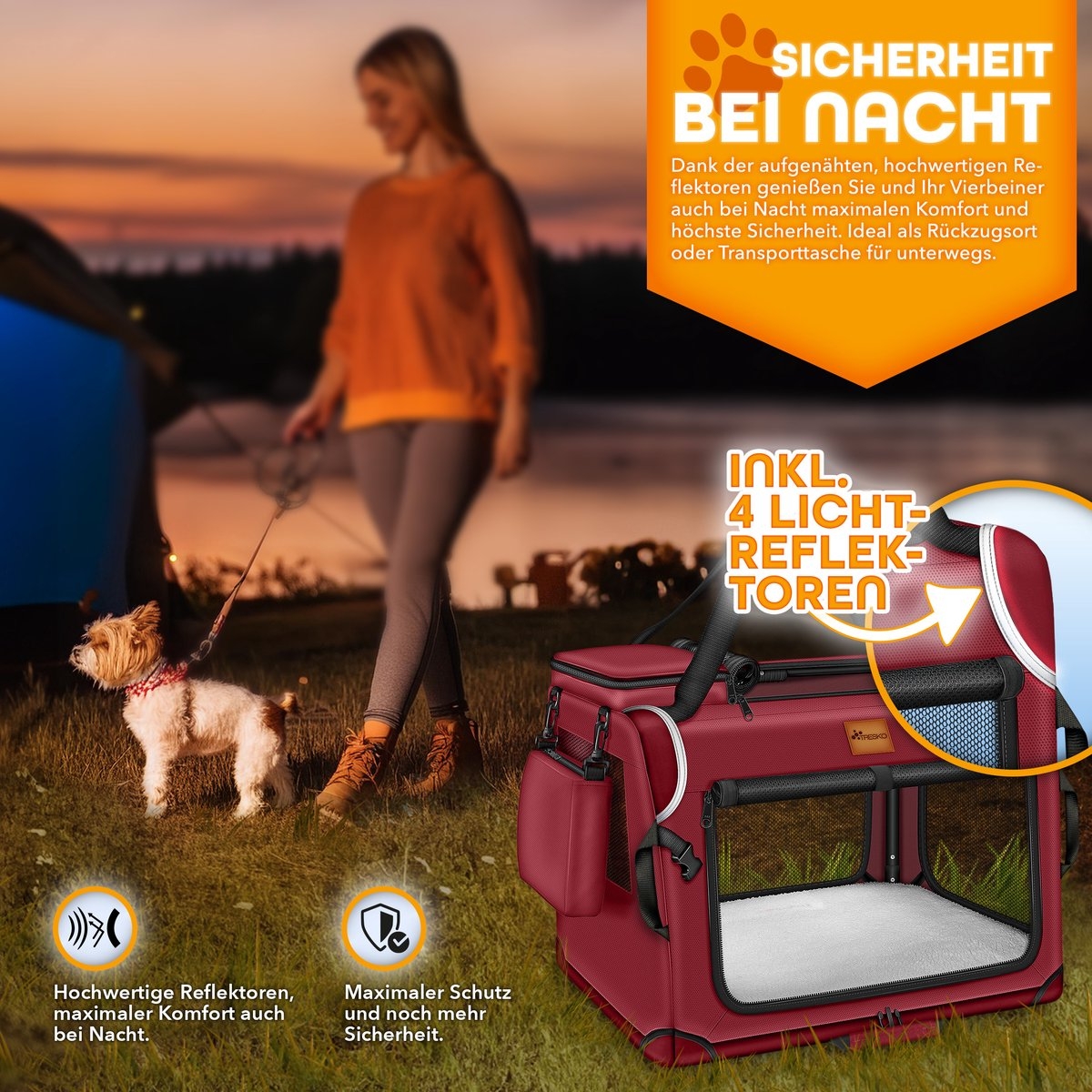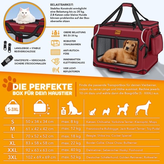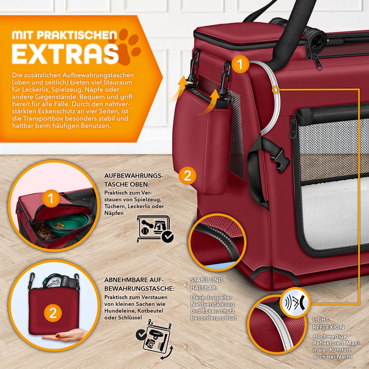 VEELZIJDIG GEBRUIK: Deze draagbare transportmand is perfect voor auto- en vliegtuigreizen, uitstapjes, dierenartsbezoeken, thuisgebruik en training. Hij kan zowel binnen als buiten worden gebruikt om uw hond comfortabel en veilig te vervoeren. De transportmand is essentieel voor honden- en kattenbezitters. Er passen snoepjes, speelgoed, poepzakjes, een riem, handdoeken en nog veel meer in de twee ruime vakken. INTELLIGENTE CONSTRUCTIE: Onze hondentransportmand is gemaakt van scheur- en krasbestendig materiaal en biedt een stabiele en duurzame transportoplossing voor honden van alle groottes. Hij is ontworpen om jarenlang mee te gaan en uw hond veilig te houden. De openingen aan drie zijden (boven, voor en zijkant) zorgen voor een extra groot gezichtsveld. Alle in- en uitgangen zijn bovendien voorzien van een vergrendeling.