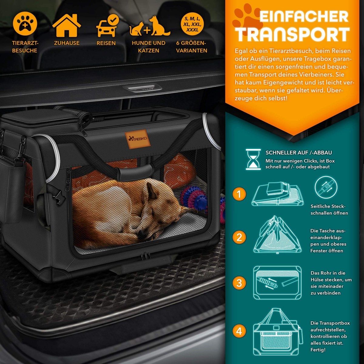 RUIMTE VOOR ALLE MATEN: De dierentransportbox is opvouwbaar en verkrijgbaar in verschillende maten, waardoor er voldoende ruimte is voor kleine, middelgrote en grote honden en katten. De gehele buitenkant van de TRESKO dierentransportbox is afneembaar en machinewasbaar. Vlekken of ander vuil kunnen worden verwijderd met een vochtige doek of een borstel.