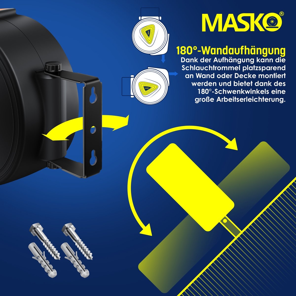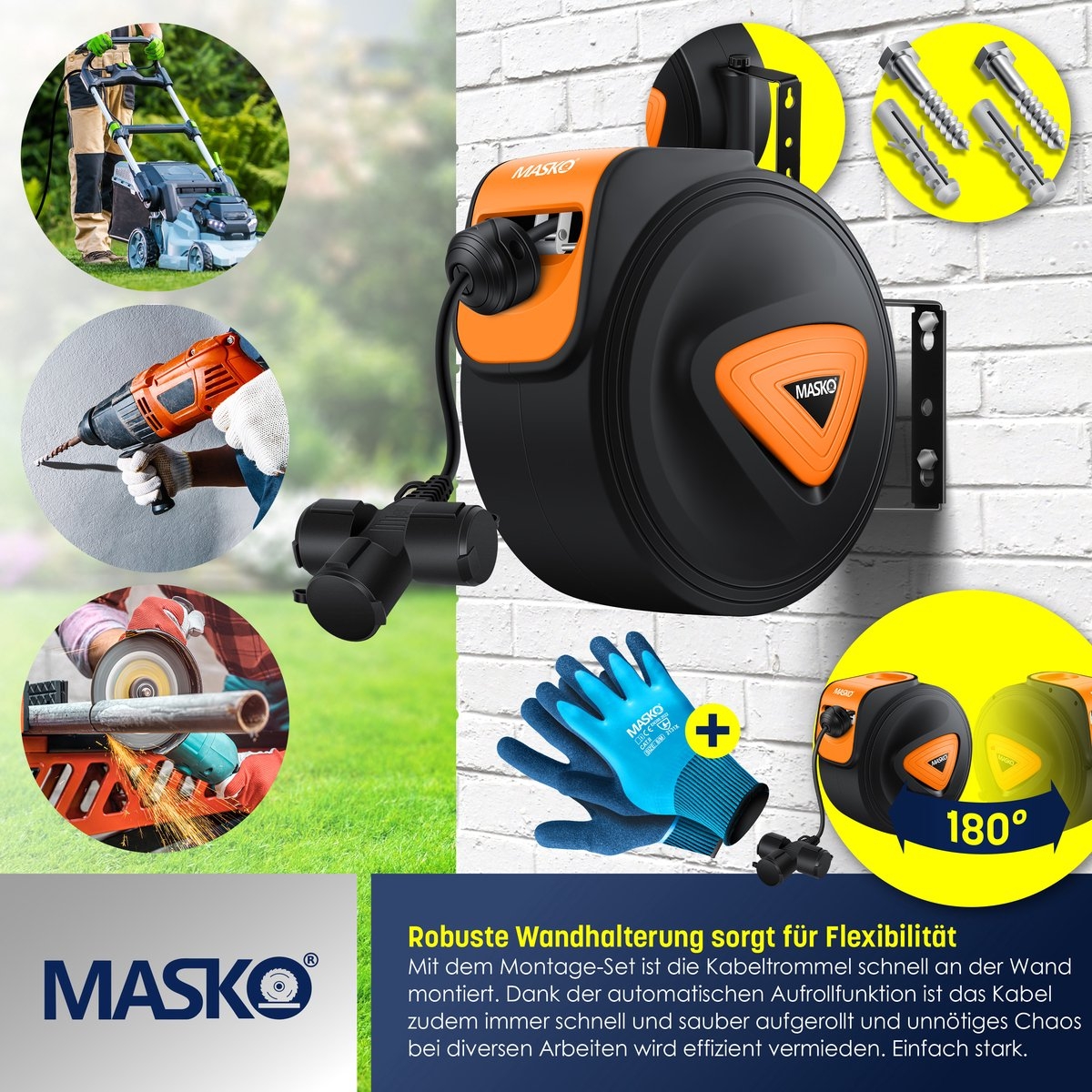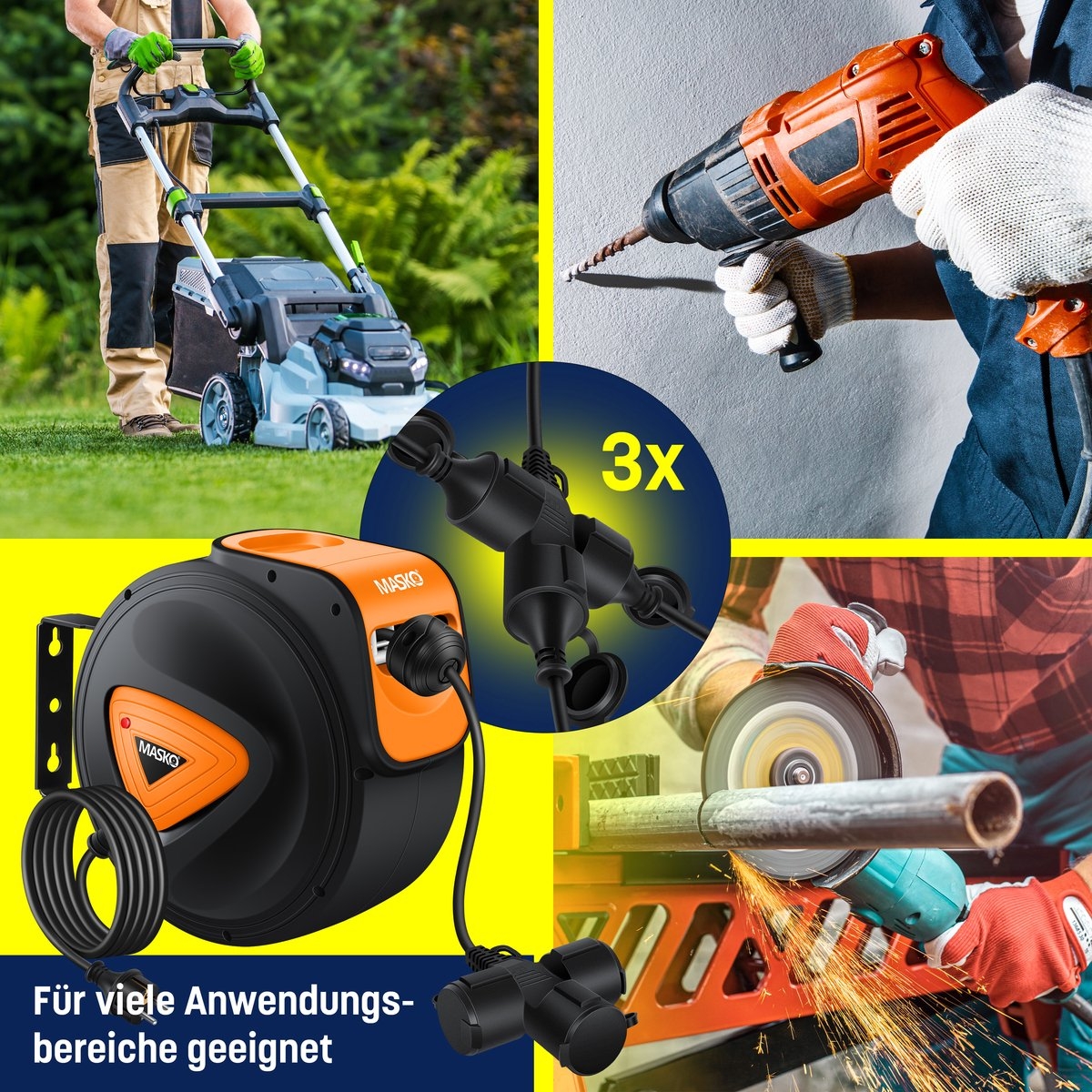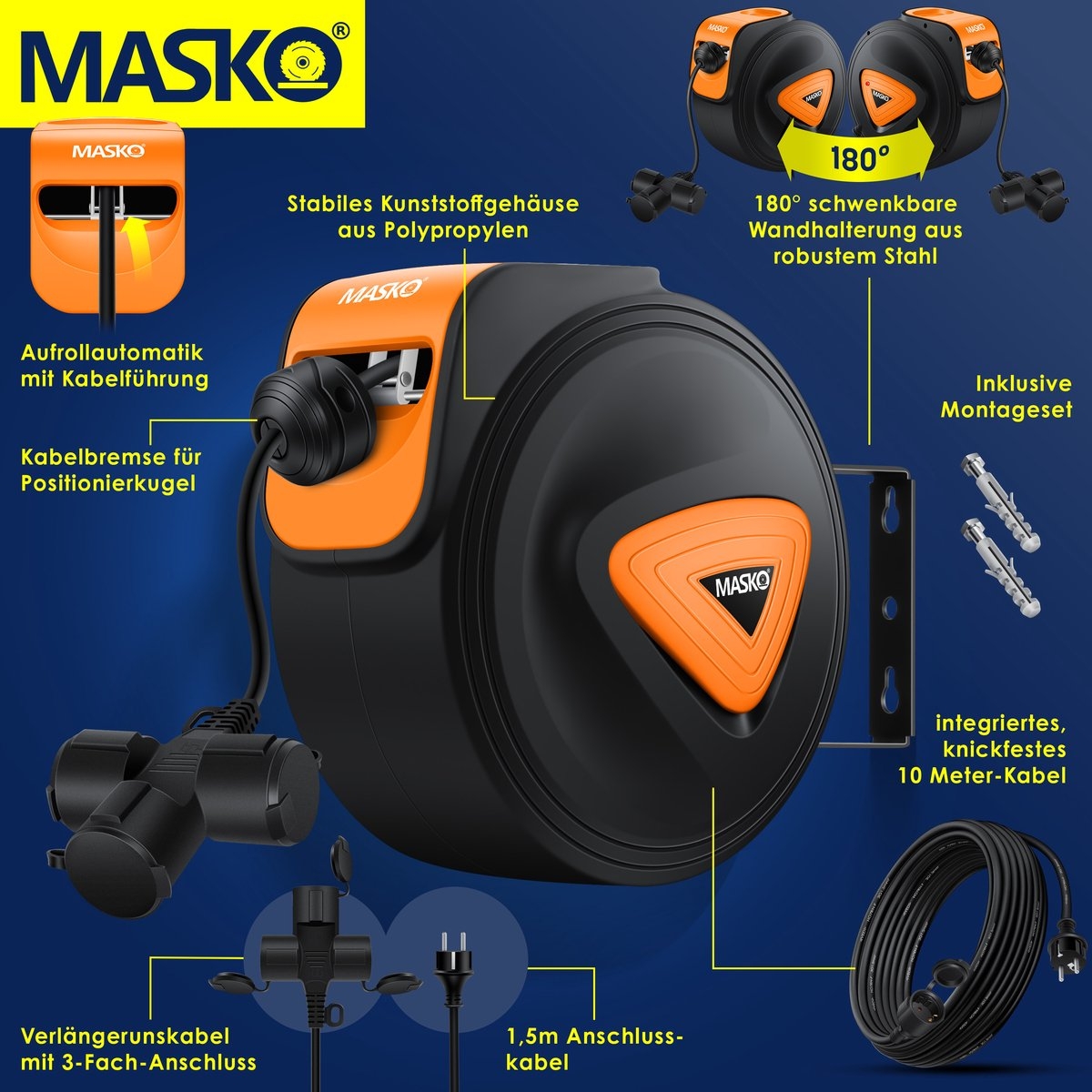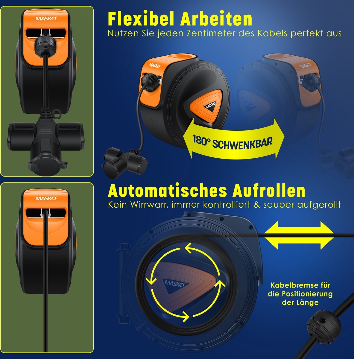 FLEXIBELE POSITIONERING: De Kabelhaspel van MASKO biedt maximale flexibiliteit bij het plaatsen en veelzijdigheid bij het aansluiten. De 180° draaibare wandmontage maakt het mogelijk om de haspel precies daar te monteren waar u deze nodig heeft. Met een royale aansluitkabel van 1,5 meter en een 3-voudige aansluiting heeft u de vrijheid om verschillende apparaten tegelijkertijd aan te sluiten. Hierdoor wordt uw werkruimte efficiënter en beter georganiseerd.