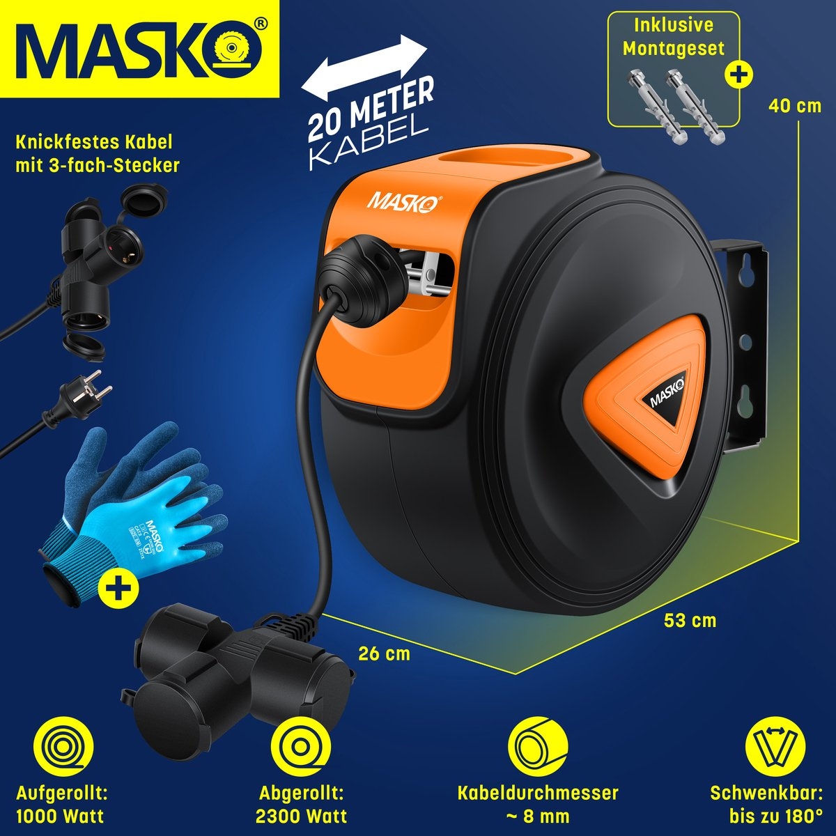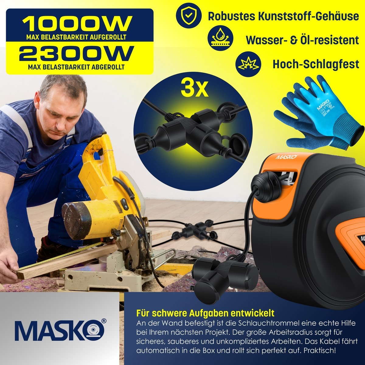 MAXIMALE BELASTING: De MASKO Kabelhaspel is ontworpen om zelfs aan veeleisende eisen te voldoen. Met een capaciteit van maximaal 1000 Watt in opgerolde toestand en indrukwekkende 2300 Watt in afgerolde toestand is het een krachtige energieoplossing voor verschillende toepassingen. Deze indrukwekkende belastbaarheid zorgt ervoor dat u uw elektrisch gereedschap en apparaten efficiënt en zonder onderbrekingen kunt bedienen.