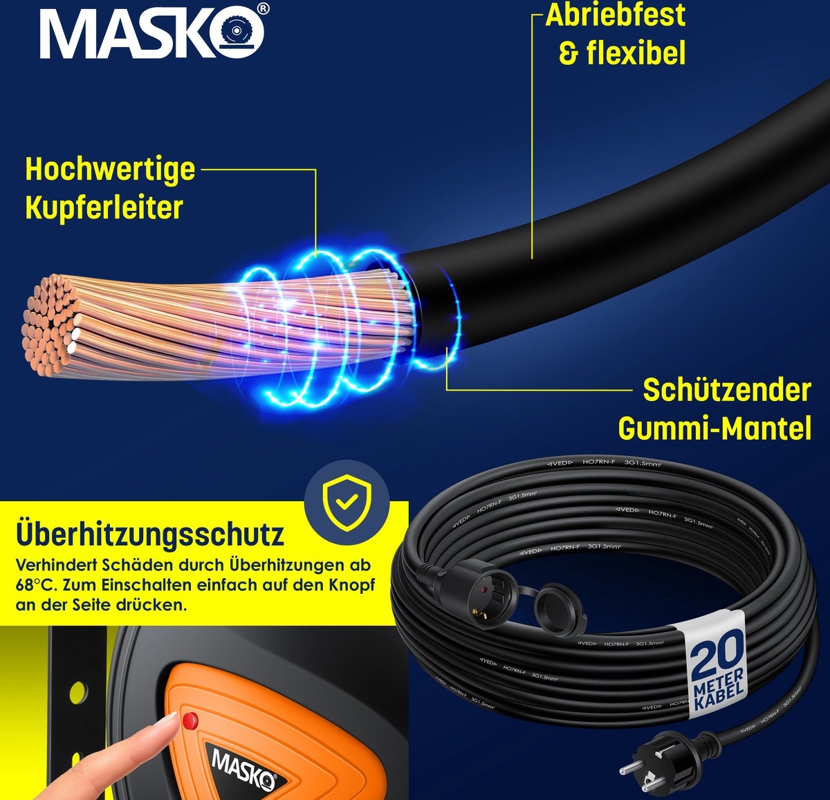 VEILIG EN EFFICIËNT: Veiligheid en efficiëntie staan voorop bij MASKO. De kabelrem met positioneringskogel maakt nauwkeurige instelling van de kabellengte mogelijk, wat vervelende wirwar van kabels voorkomt. Daarnaast beschikt de kabelhaspel over een geïntegreerde oververhittingsbeveiliging die uw werkomgeving veiliger maakt. Dit beschermingsmechanisme treedt in werking zodra de temperatuur 68°C bereikt, en waarborgt zo niet alleen de veiligheid, maar ook de duurzaamheid van de kabelhaspel en uw aangesloten apparaten.