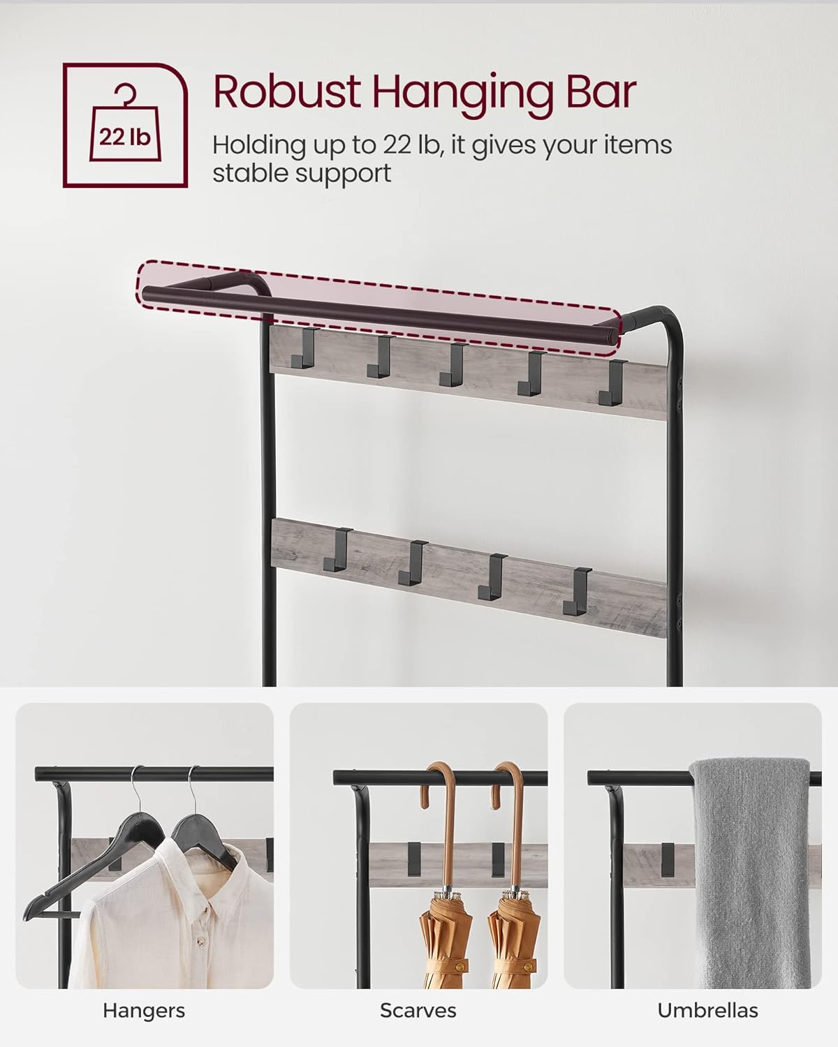 • EEN HART VOOR SCHOENEN: De kapstok heeft niet alleen negen stevige haken en een kledingroede in het bovenste gedeelte. Daarnaast biedt hij twee planken voor schoenen, die je eenvoudig op de stevige bank kunt plaatsen