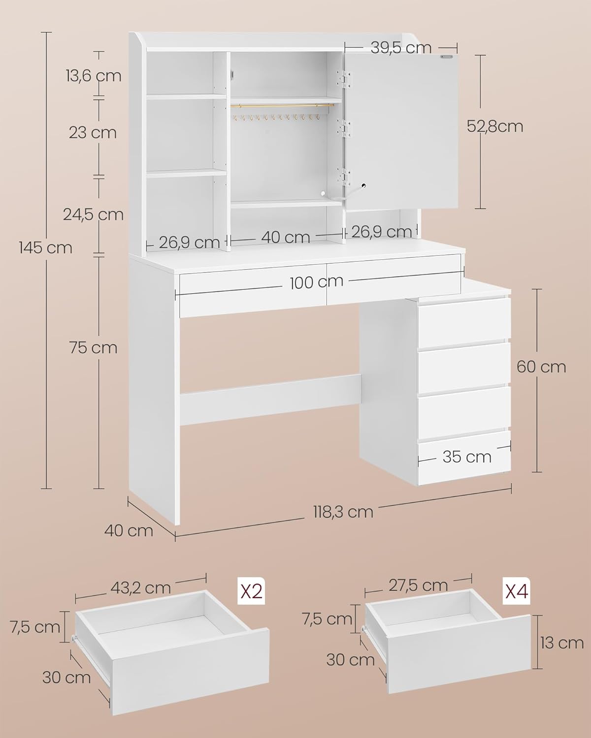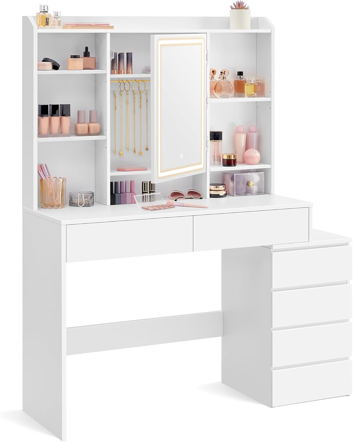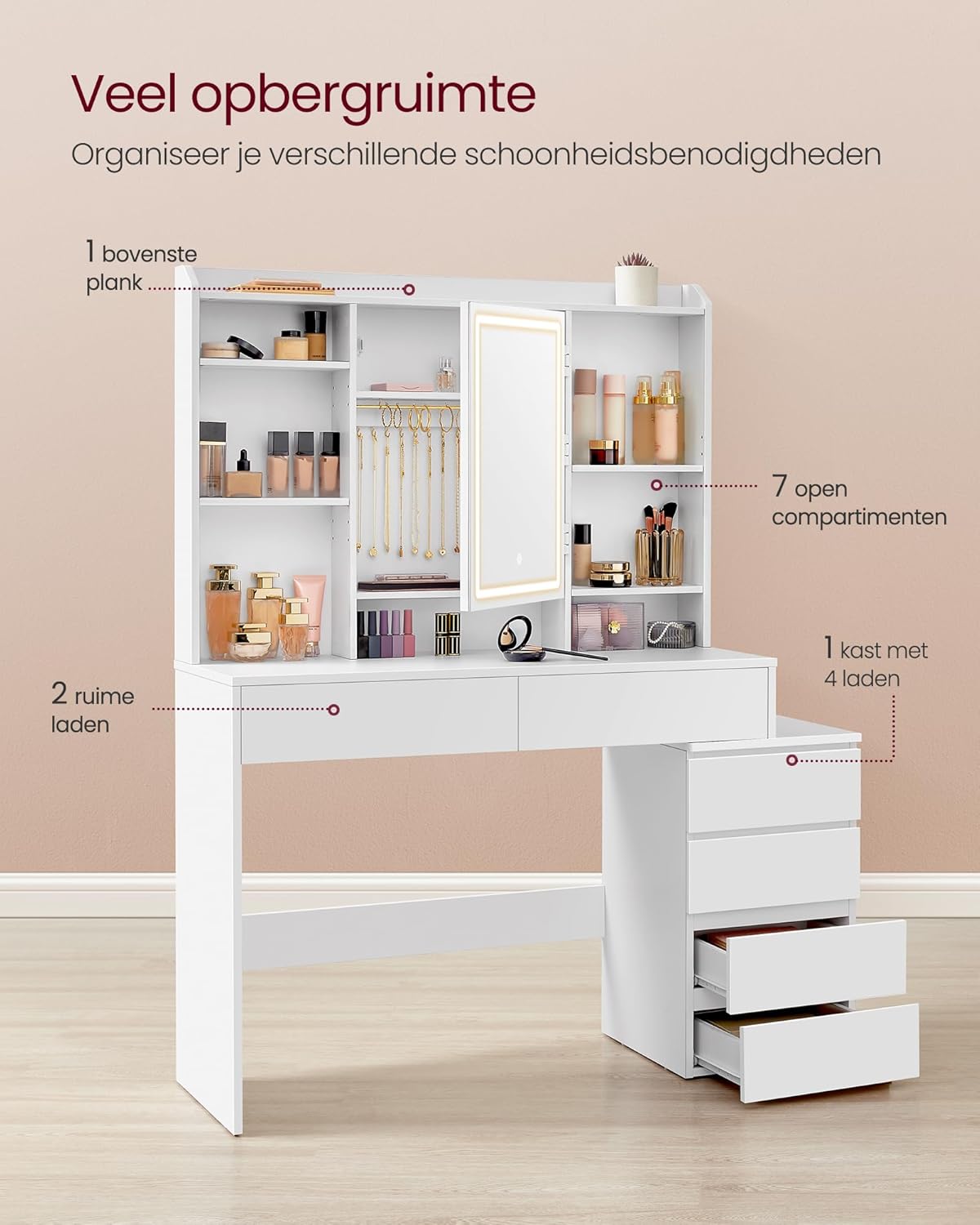 Een plank bovenin, 7 open vakken, 2 grote lades, 2 planken en haken achter de spiegel en een kast met 4 lades. Deze kaptafel biedt voldoende ruimte om al je spullen netjes op te bergen.