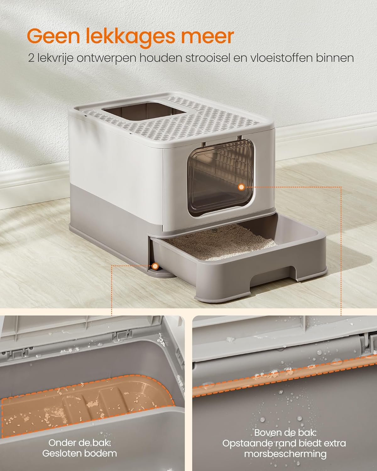 - Geen lekken: de verlengde rand boven de box en een gesloten bodem eronder voorkomen dat strooisel of kattenurine op de grond terechtkomt. Een praktische hulp als je kat graag graaft of staat om te plassen