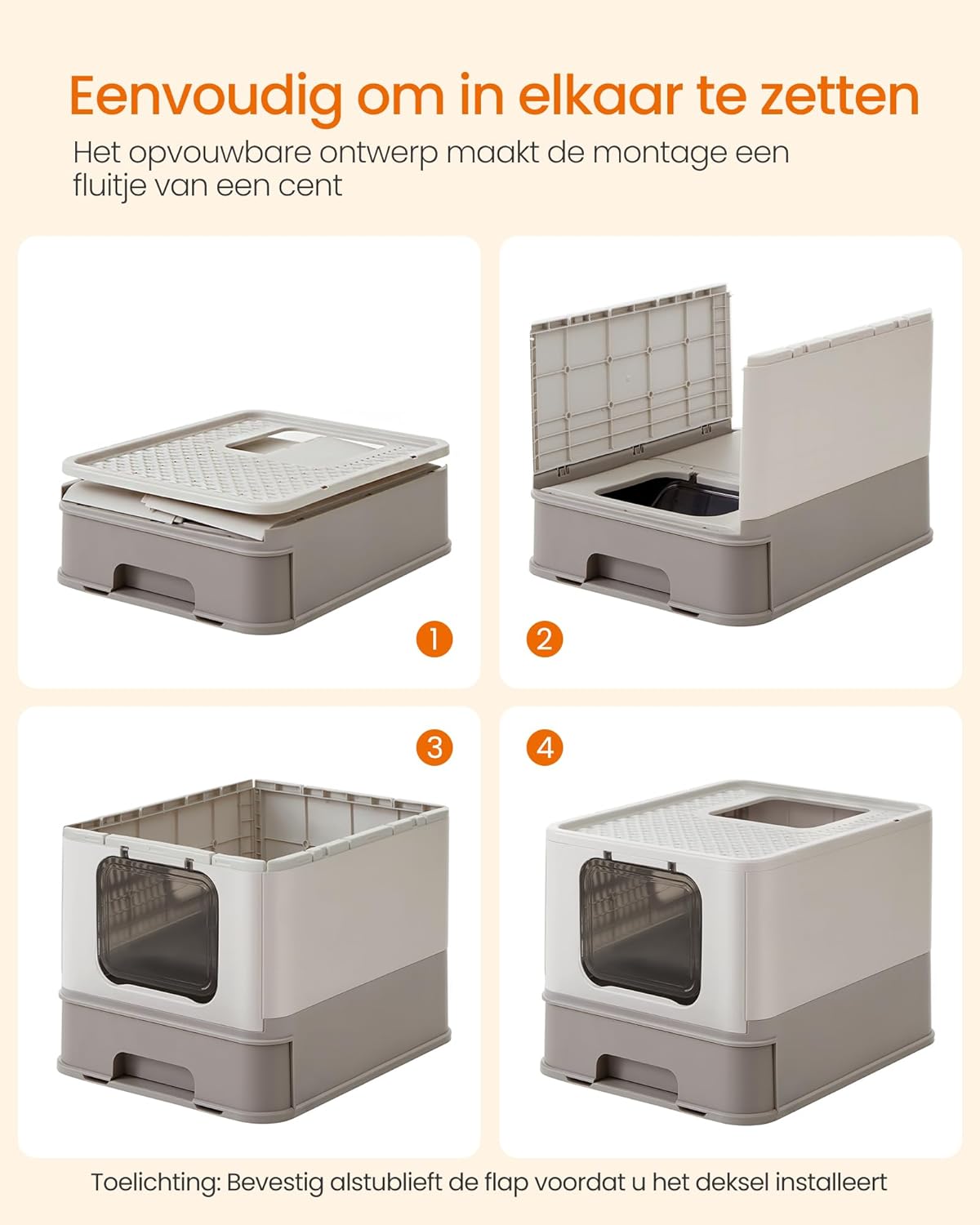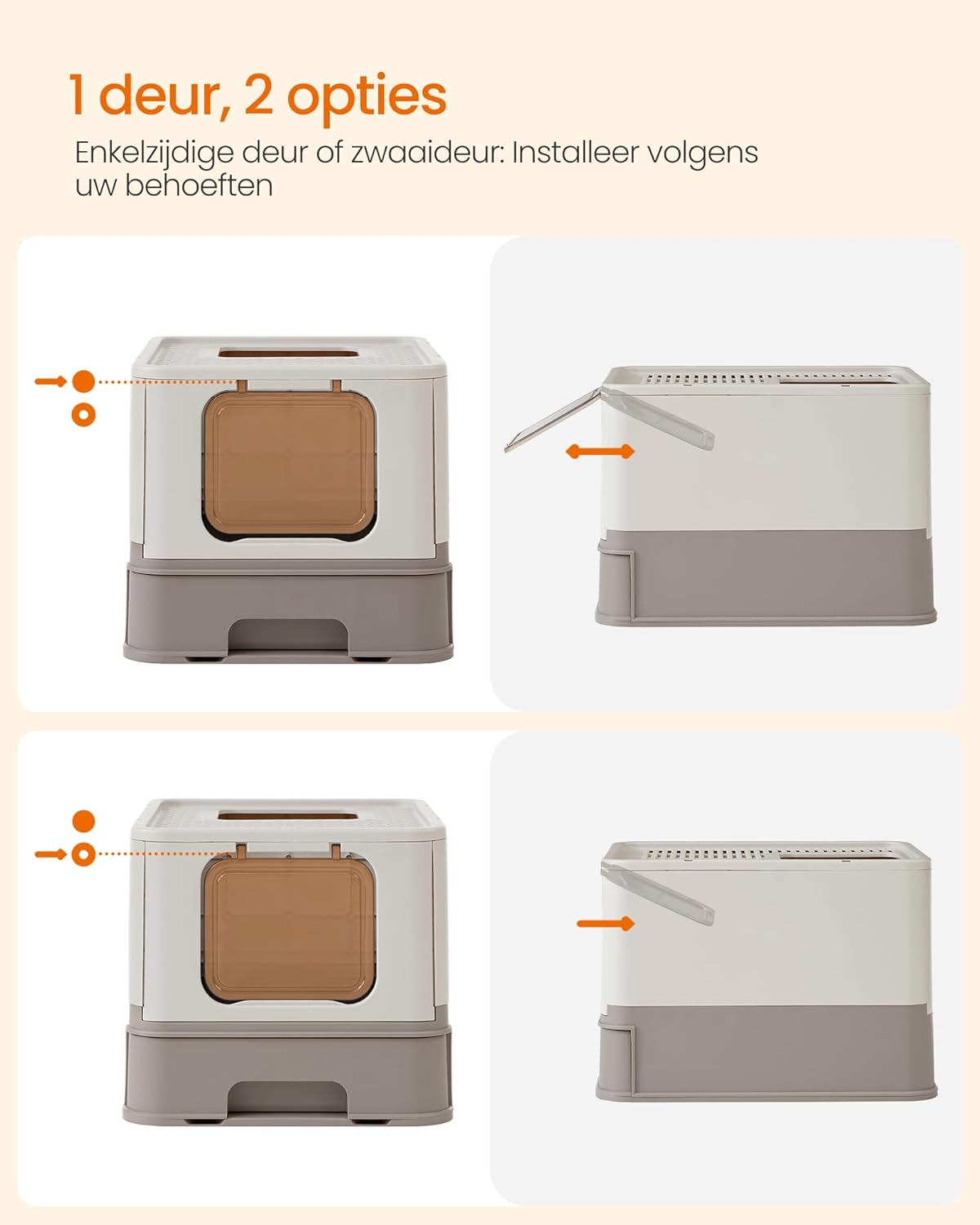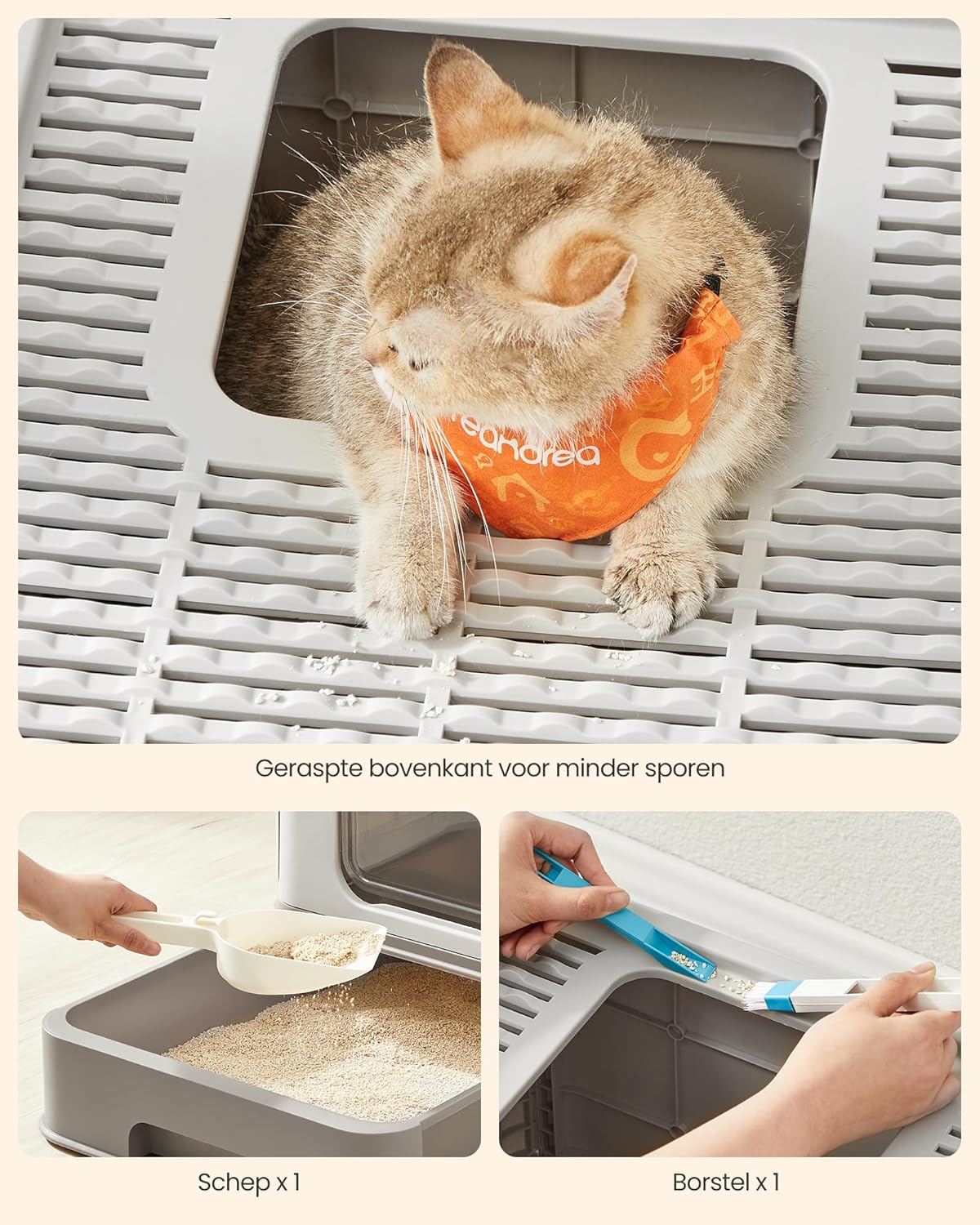 - Gemakkelijk te legen en te reinigen: met een uittrekbare lade kan de kattenbak gemakkelijk worden geleegd en met een nieuw strooisel worden gevuld. Meegeleverde schep en borstel helpen om het afval te schoppen en het strooisel boven of in de hoeken te reinigen