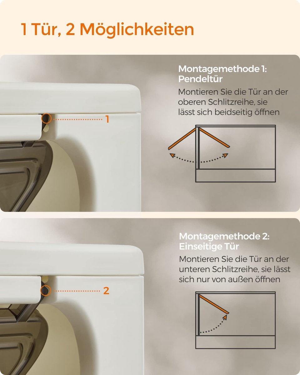 - [1 deur, 2 configuraties] De deur kan zo worden ingesteld dat hij slechts eenzijdig open kan worden en de bovenste opening als uitgang kan worden gebruikt. Ook het aan beide zijden openen van de deur kan worden ingesteld – naar behoefte. Als je kat een beginner is, kun je de deur ook verwijderen