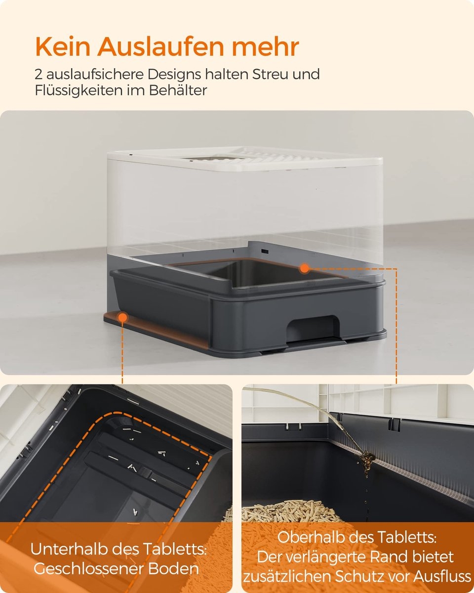 - Geen lekken: de verlengde rand boven de box en een gesloten bodem eronder voorkomen dat strooisel of kattenurine op de grond terechtkomt. Een praktische hulp als je kat graag graaft of staat om te plassen