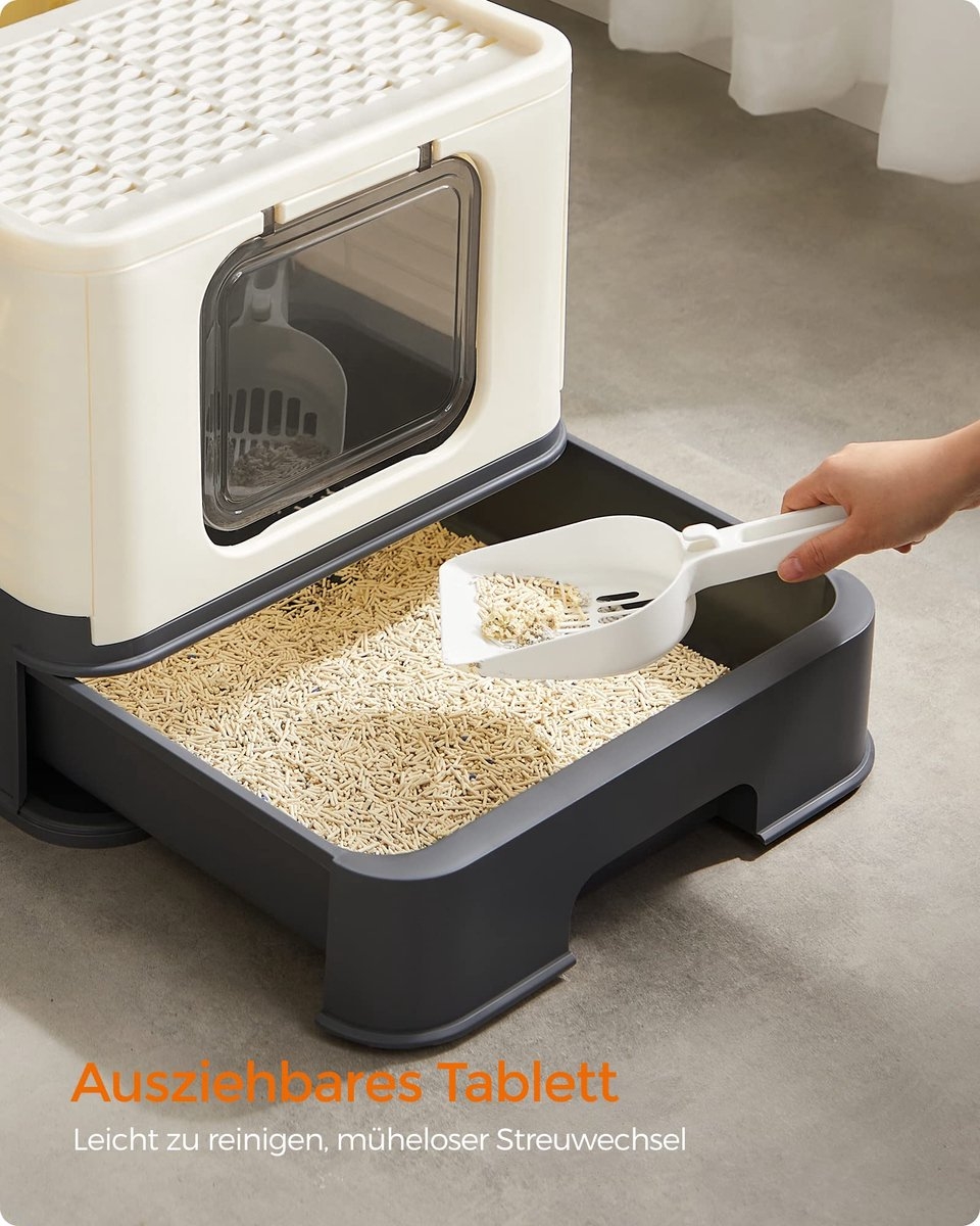 - Gemakkelijk te legen en te reinigen: met een uittrekbare lade kan de kattenbak gemakkelijk worden geleegd en met een nieuw strooisel worden gevuld. Meegeleverde schep en borstel helpen om het afval te schoppen en het strooisel boven of in de hoeken te reinigen