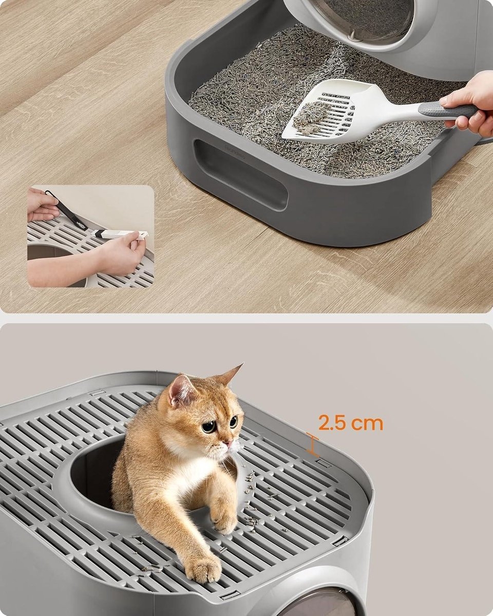 Deze kattenbak is ontworpen voor het gemak van zowel u als uw kat. Met een uittrekbare lade en meegeleverde schep en borstel wordt het schoonmaken een fluitje van een cent. Het ruime interieur zorgt ervoor dat uw kat comfortabel zijn behoefte kan doen. Het roosterontwerp helpt bij het minimaliseren van vervuiling rondom de bak, terwijl de dubbellaagse constructie zijlekkage voorkomt.
