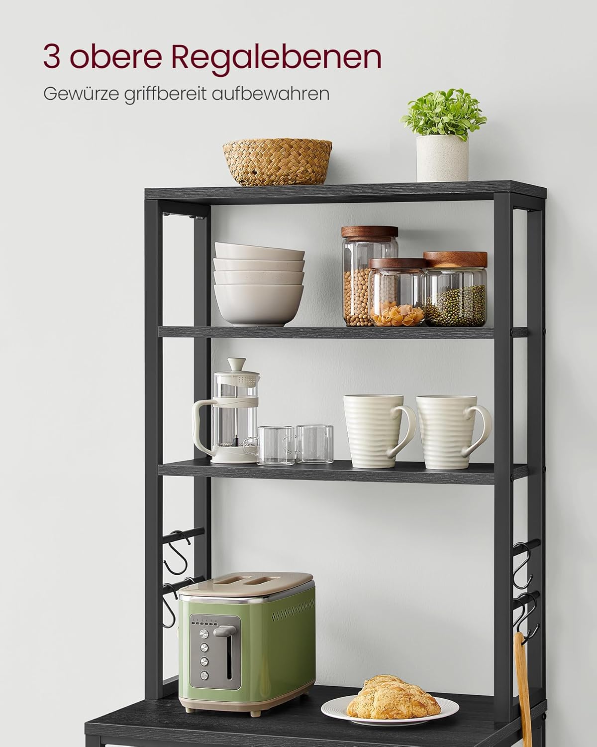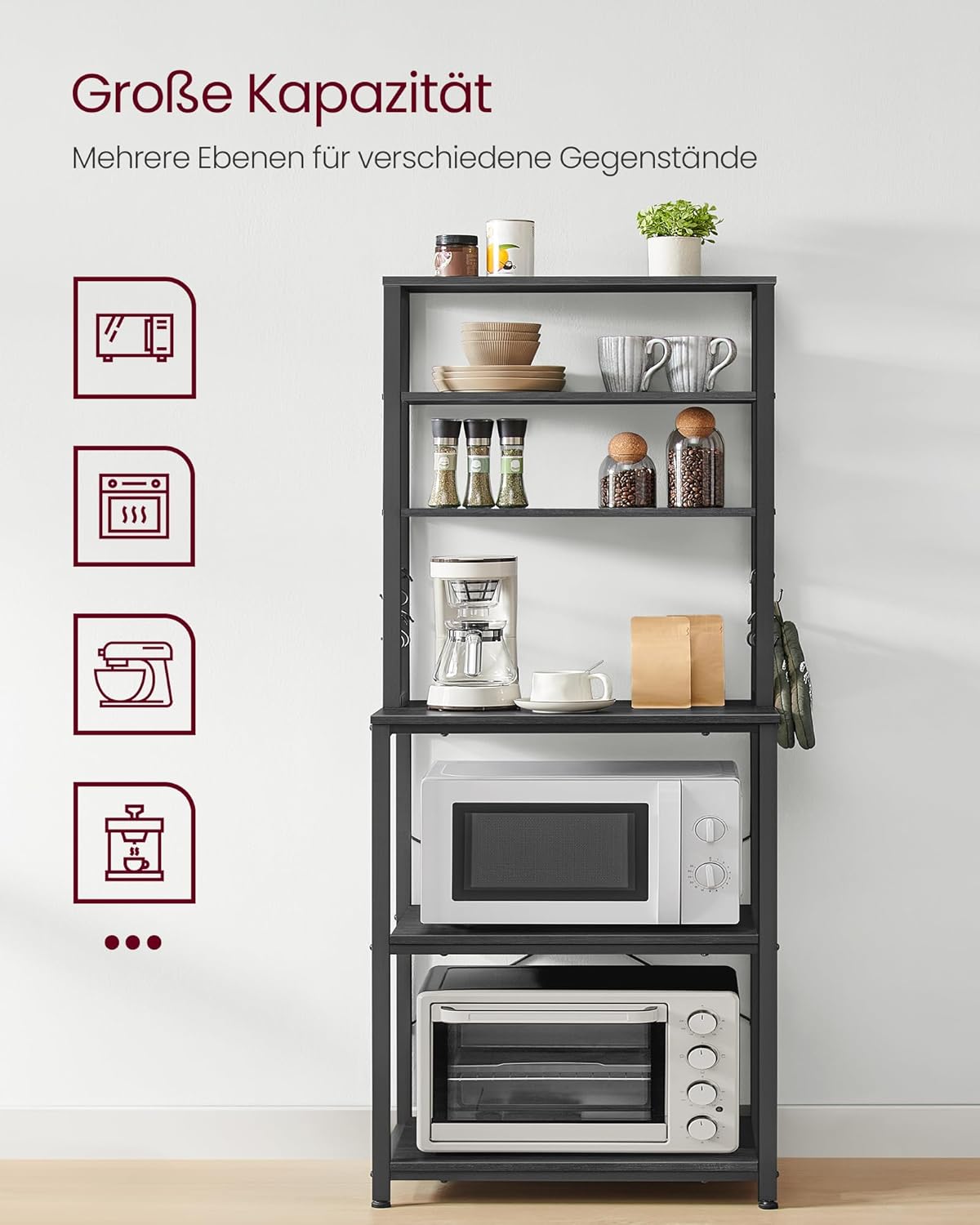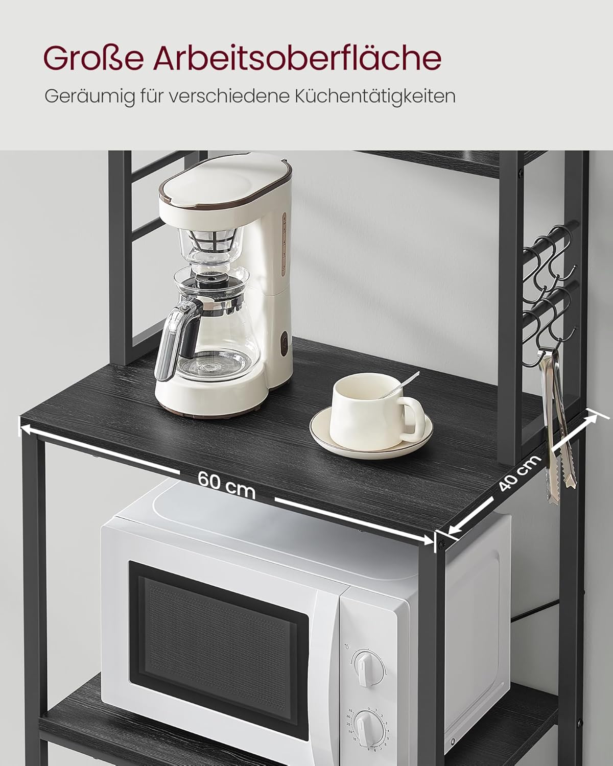 Solide constructie: dankzij de combinatie van een robuust stalen frame en duurzaam spaanplaat is dit donkergrijze staande rek sterk, solide en kan het gemakkelijk uw magnetron, koffiezetapparaat en ander keukengerei dragen.
