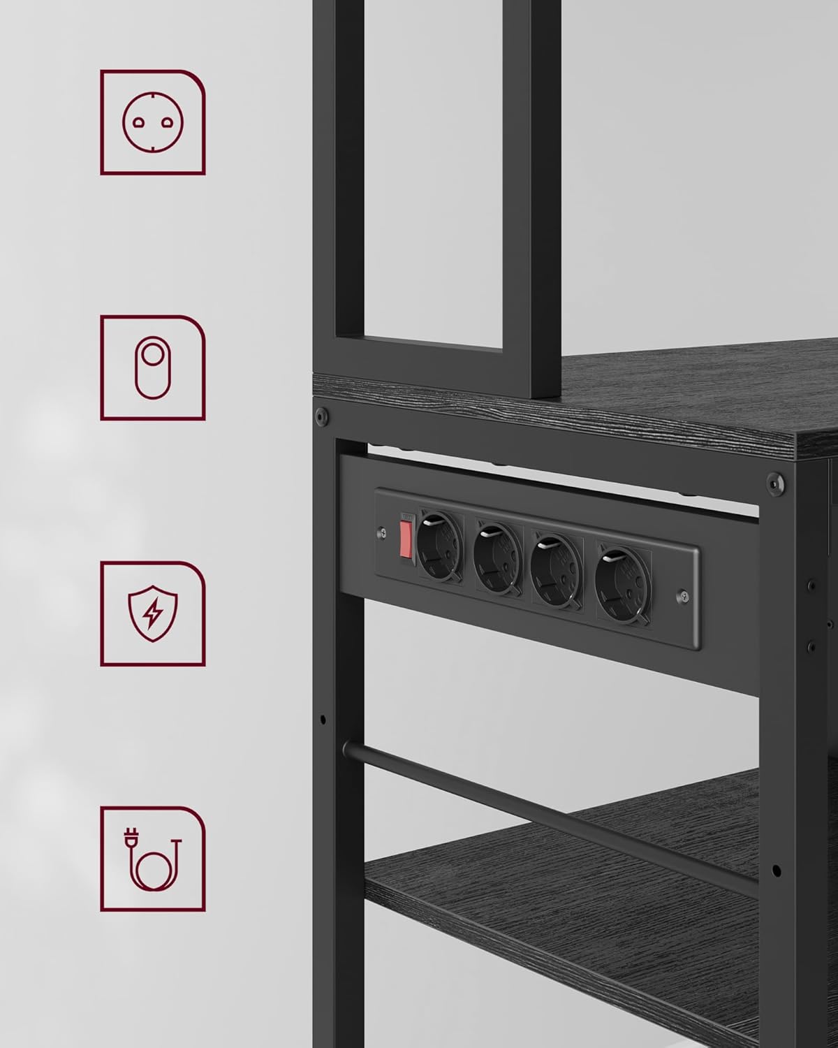 Dit rek is uitgerust met een stekkerdoos met 4 stopcontacten, die tot 3680 watt ondersteunt. Hij beschikt over een overbelastingsbeveiliging, stroomlekbeveiliging en een aan/uit-schakelaar.