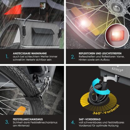 De kinderaanhanger heeft een maximaal draagvermogen van 40 kg en biedt voldoende ruimte voor 1-2 kinderen vanaf 18 maanden. De uitrolbare kunststof zeilen aan de voor-, boven- en achterkant en de getinte kunststof zeilen die uw kinderen beschermen tegen de zonnestralen, zorgen voor optimale bescherming tegen weersinvloeden. Met een ophangbare waarschuwingsvlag bent u ook bij slecht weer snel zichtbaar in het verkeer.